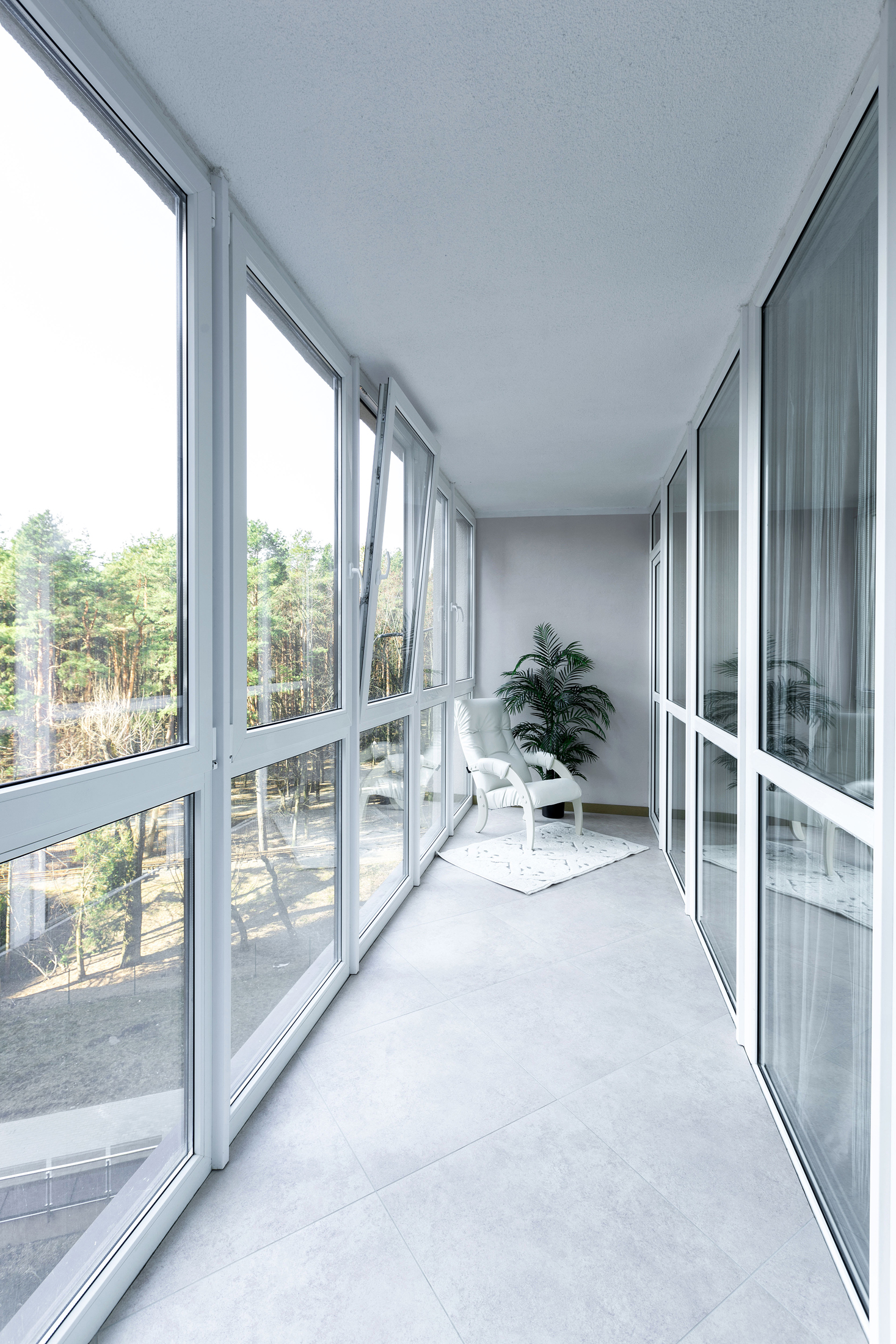 Большие панорамные окна в пол и полностью остекленные лоджии с бронзовой тонировкой.