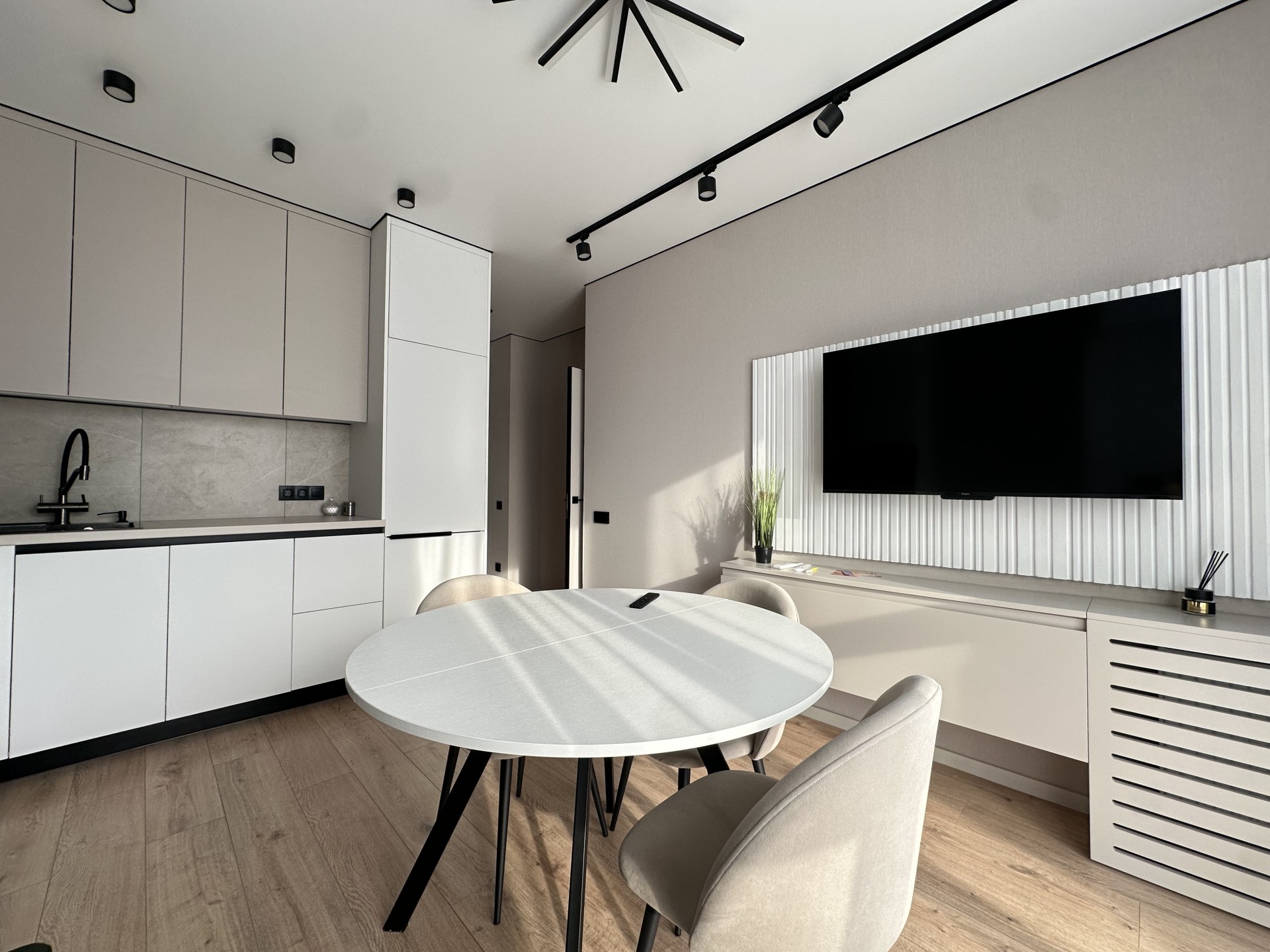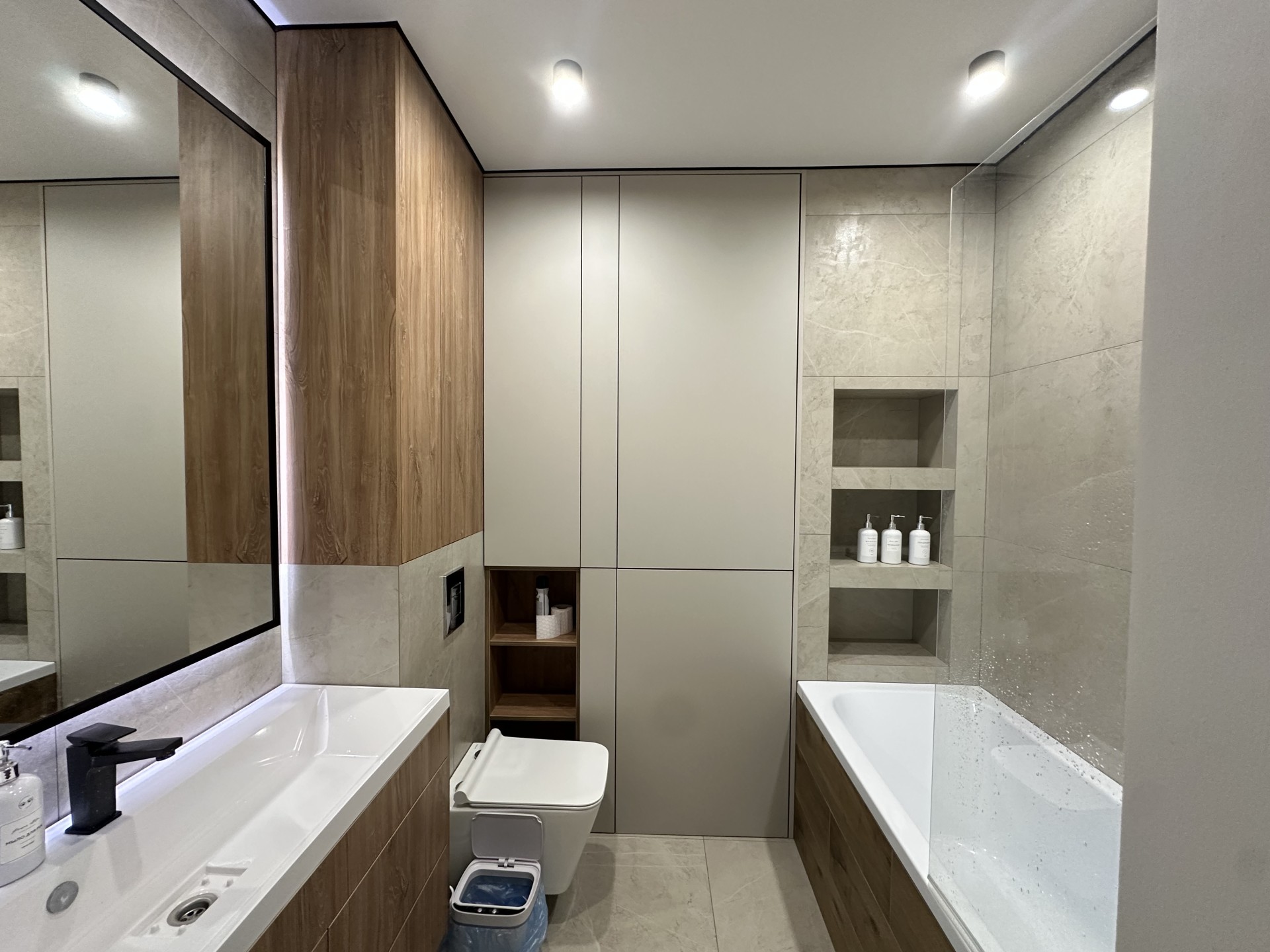В квартире есть всё необходимое как для краткосрочного, так и долгосрочного пребывания. Посудомоечная машина, стиральная машина, кондиционер, телевизор, утюг, сушилка для белья, фен, детский манеж. На 1 этаже дома находится три кофейни, wb, ozon, цветочный магазин. В 100 метрах два продуктовых магазина. В 500 метрах ТЦ Outleto. Во дворе дома детская площадка и небольшой парк.