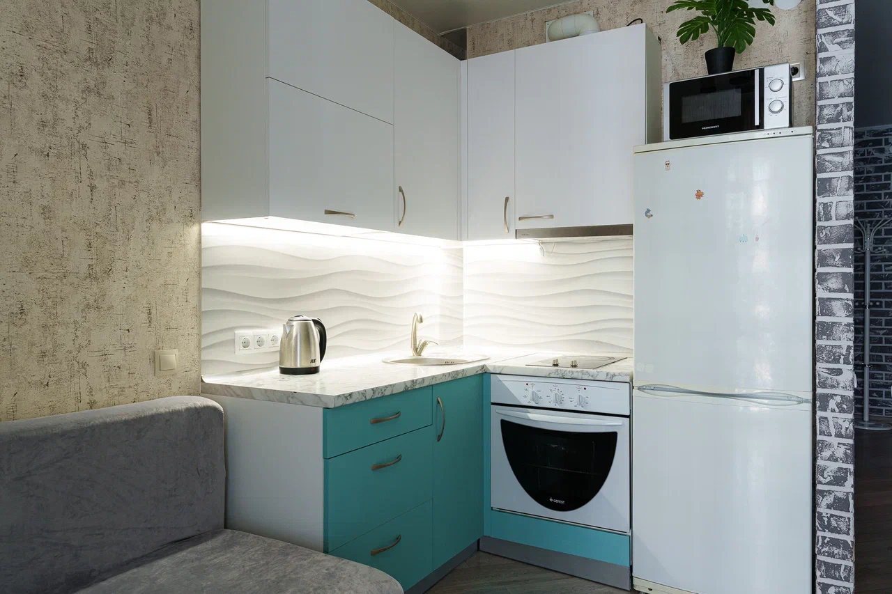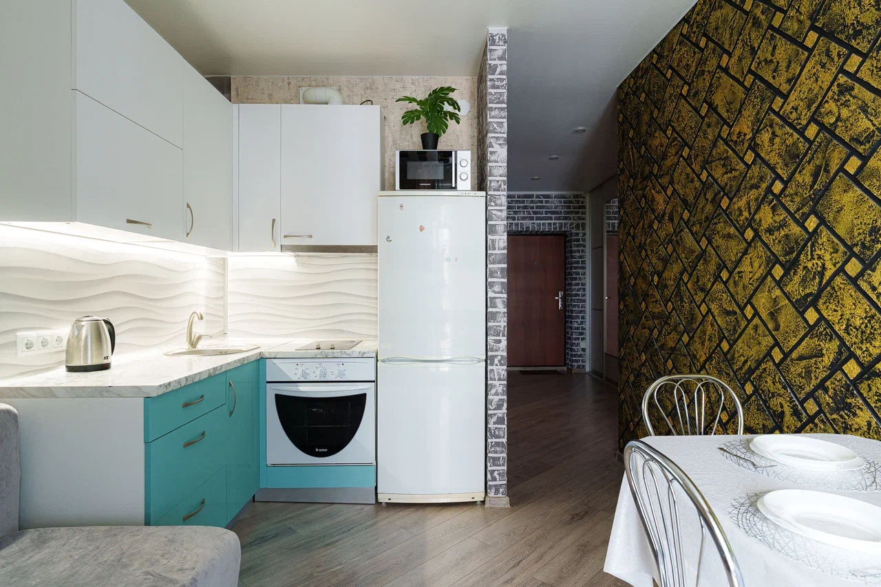 Полностью оборудованная кухня: холодильник, микроволновая печь