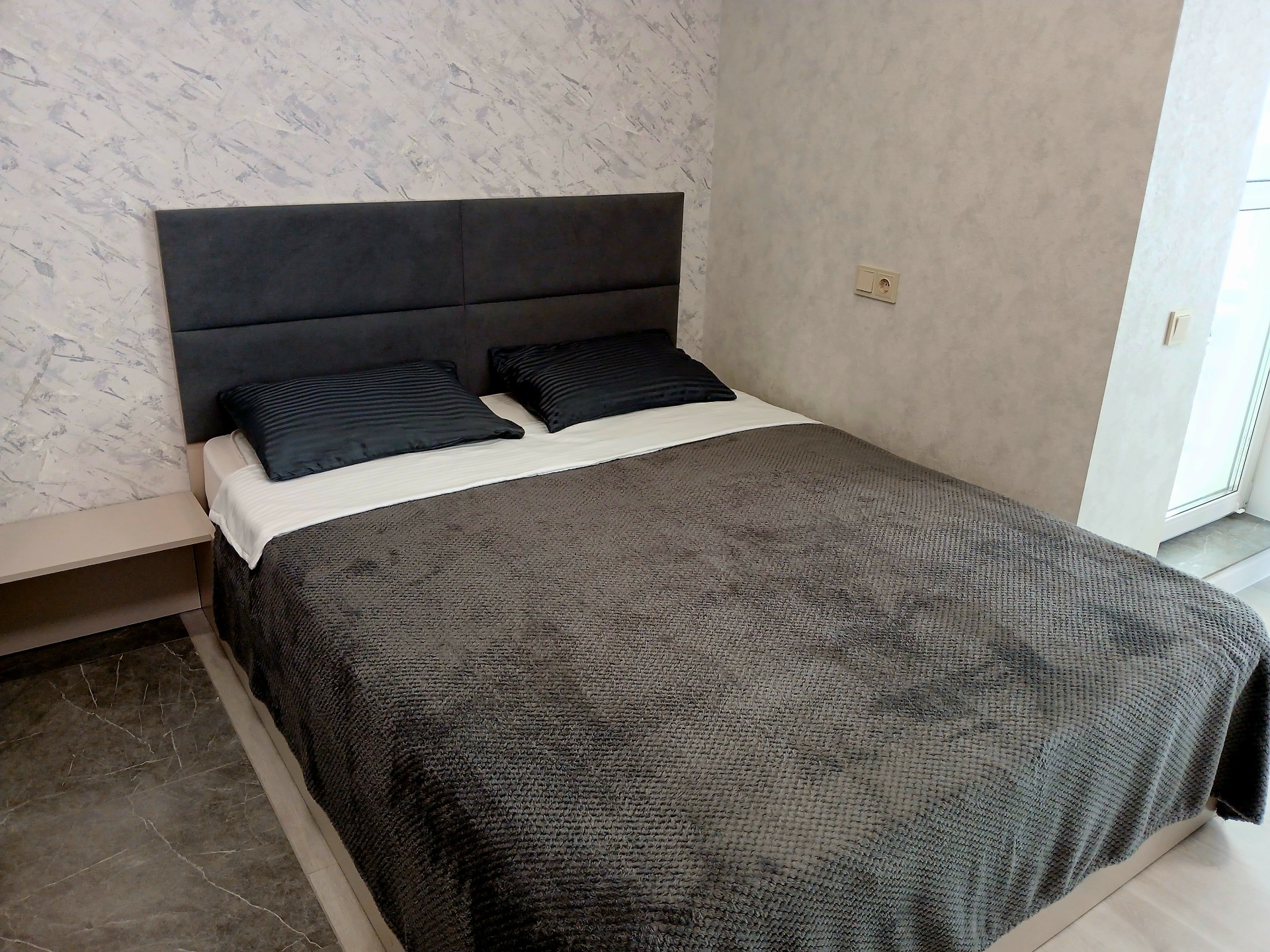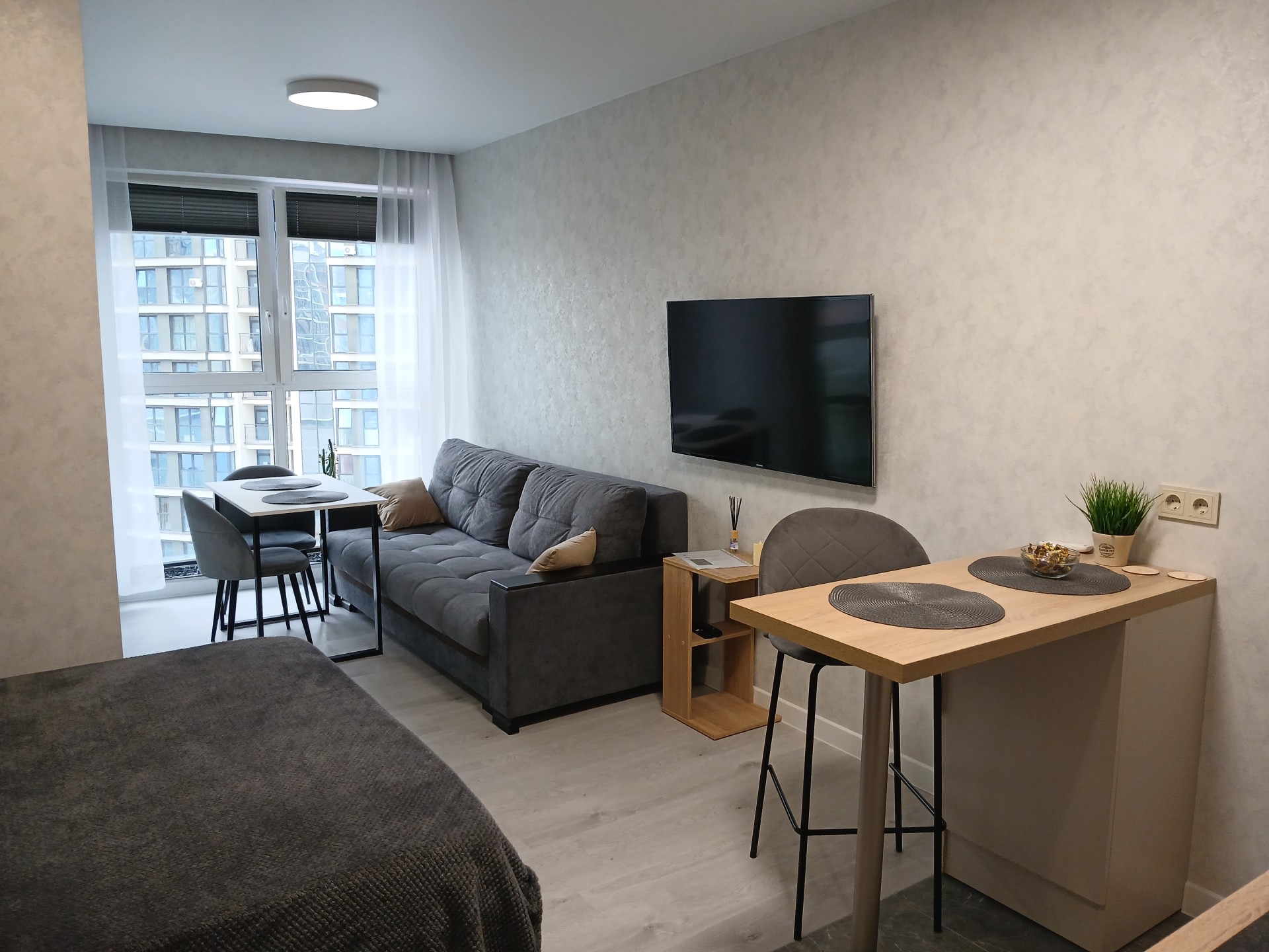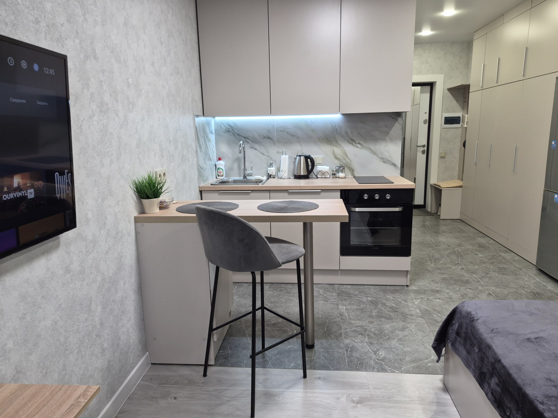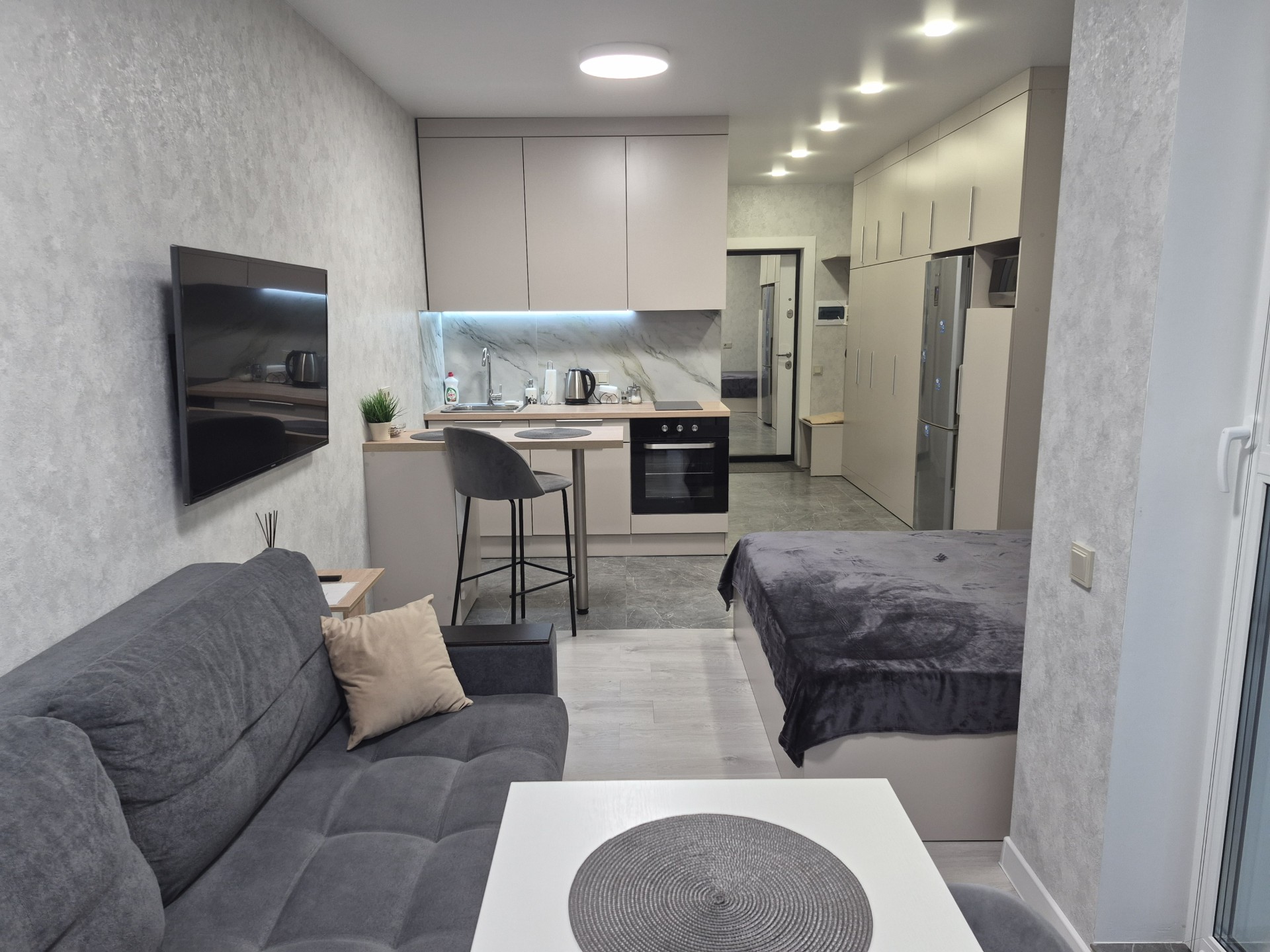 В студии есть всё необходимое для проживания и отдыха - мебель, посуда, телевизор 55' с IPTV (более 5000 каналов - кинозалы, премьеры, музыка, спорт, 18+) и SMART TV, Wi- Fi, холодильник, свч-печь, чайник, утюг, фен, стиральная машина, бойлер, белье/полотенца, чай/кофе. Спальных мест 2+2.