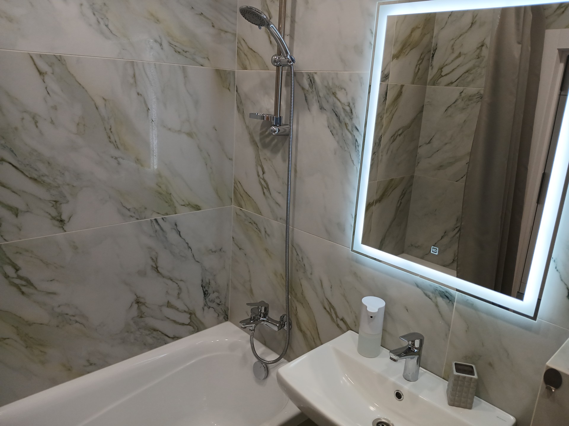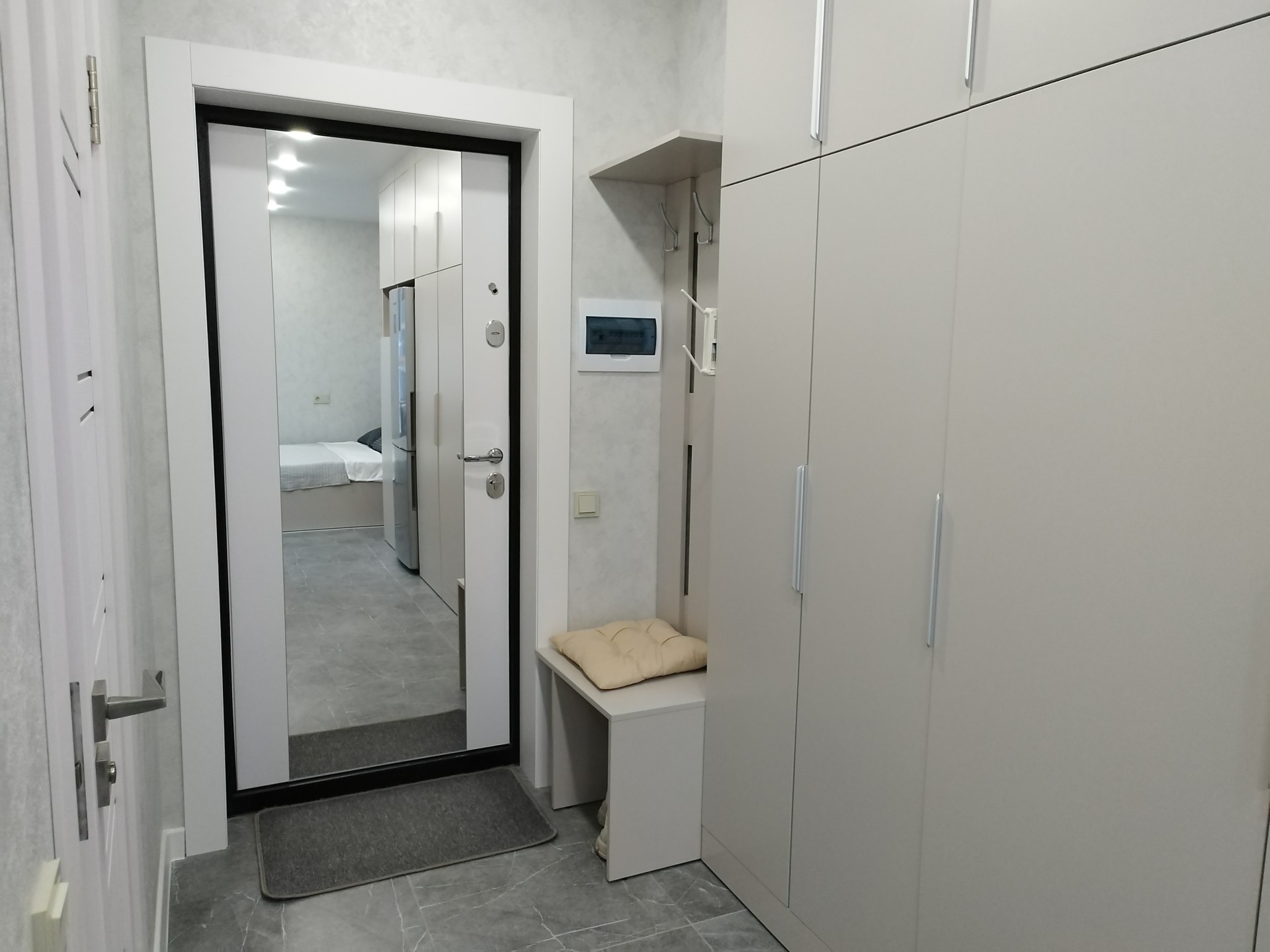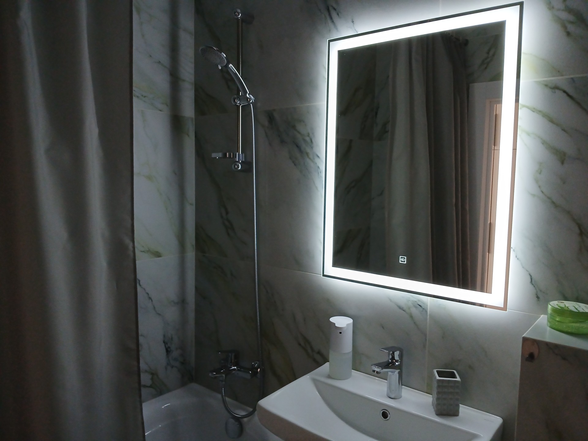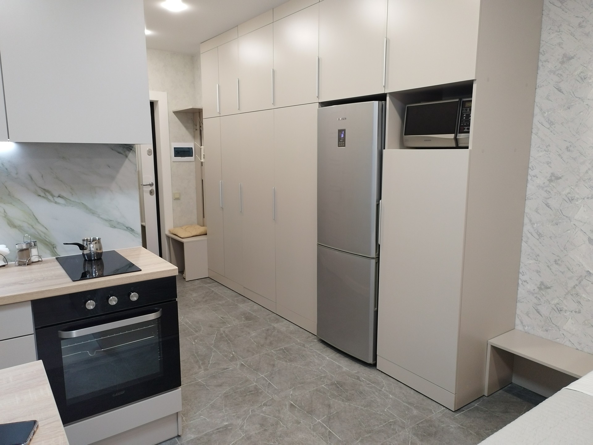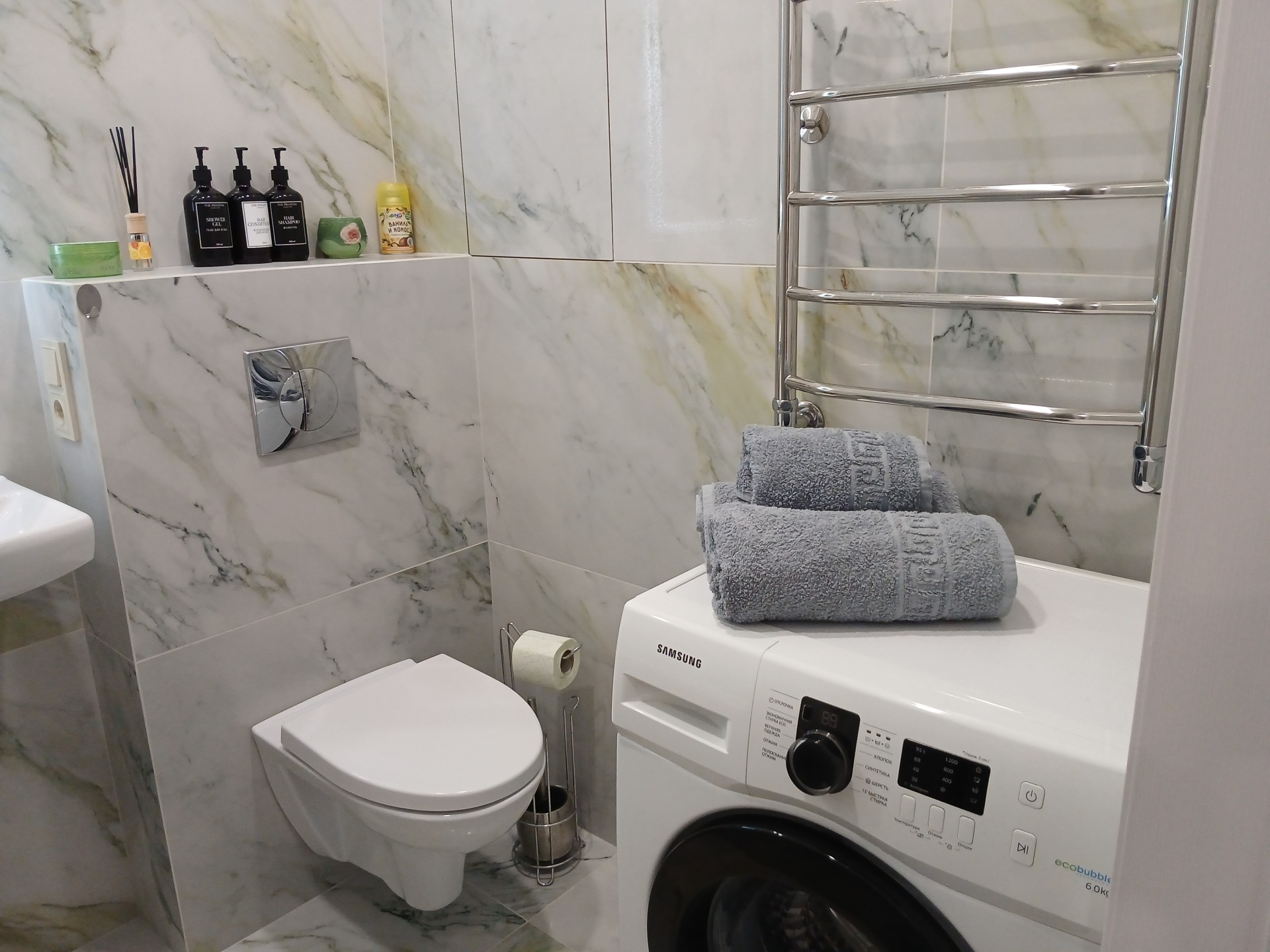 В студии есть всё необходимое для проживания и отдыха - мебель, посуда, телевизор 55' с IPTV (более 5000 каналов - кинозалы, премьеры, музыка, спорт, 18+) и SMART TV, Wi- Fi, холодильник, свч-печь, чайник, утюг, фен, стиральная машина, бойлер, белье/полотенца, чай/кофе. Спальных мест 2+2.