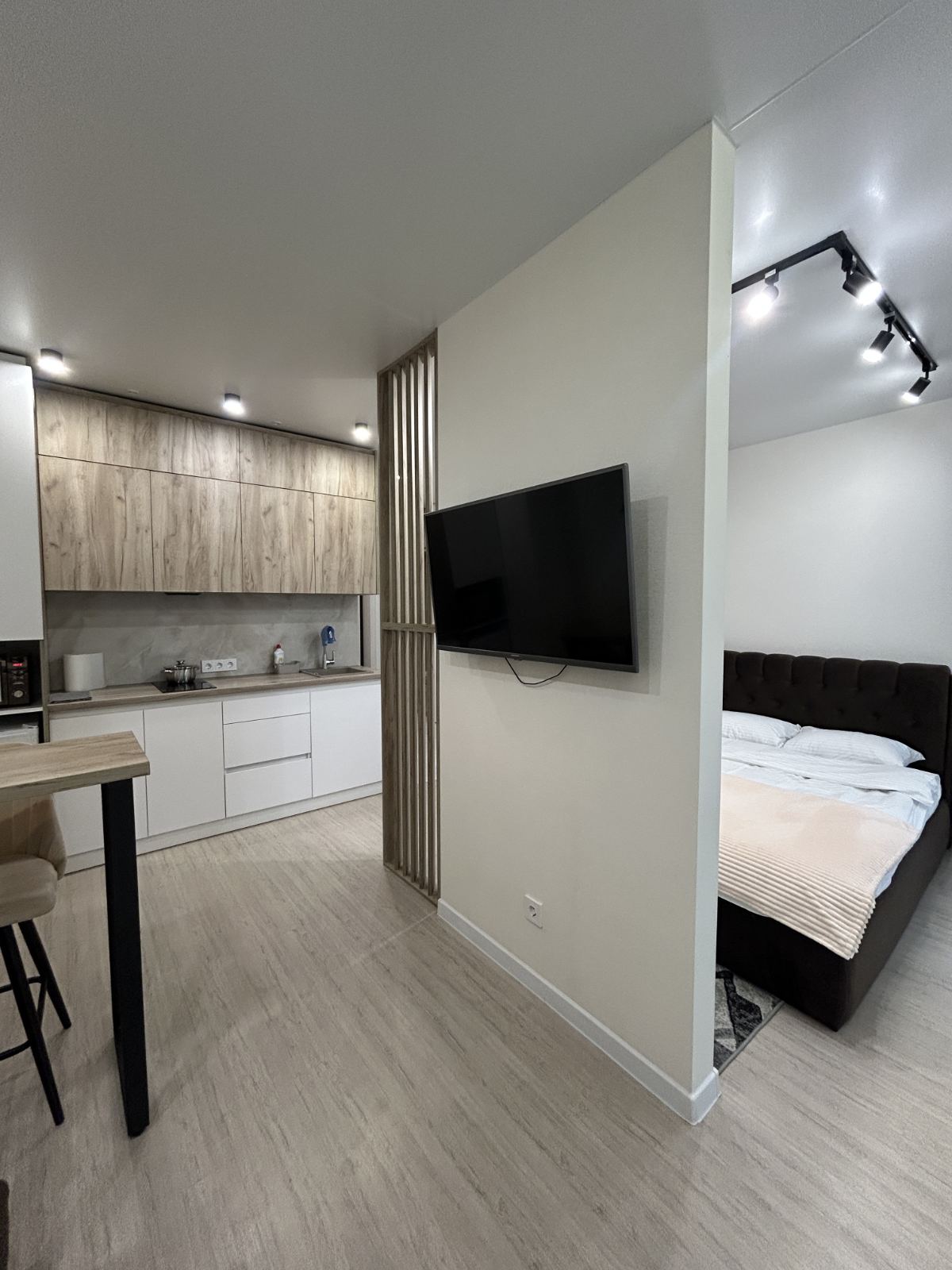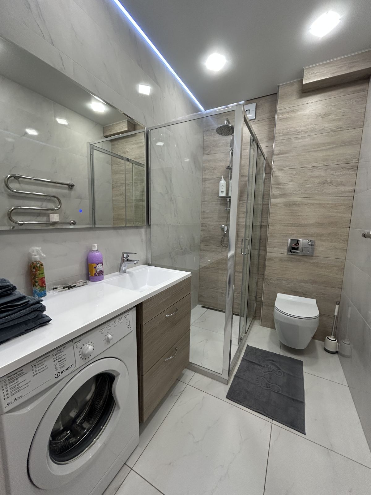 В апартаментах есть всё необходимое для комфортного пребывания, кондиционер,WiFi, смарт TV,микроволновая печь, холодильник, чайник, индукционная плита, стиральная машина, фен, утюг, свежее постельное бельё и полотенца, большая душевая кабина, в которой можно комфортно наслаждаться тропическим душем даже вдвоём и другие приятные дизайнерские решения, а шикарный вид на Минск через французские окна очень радует глаз.