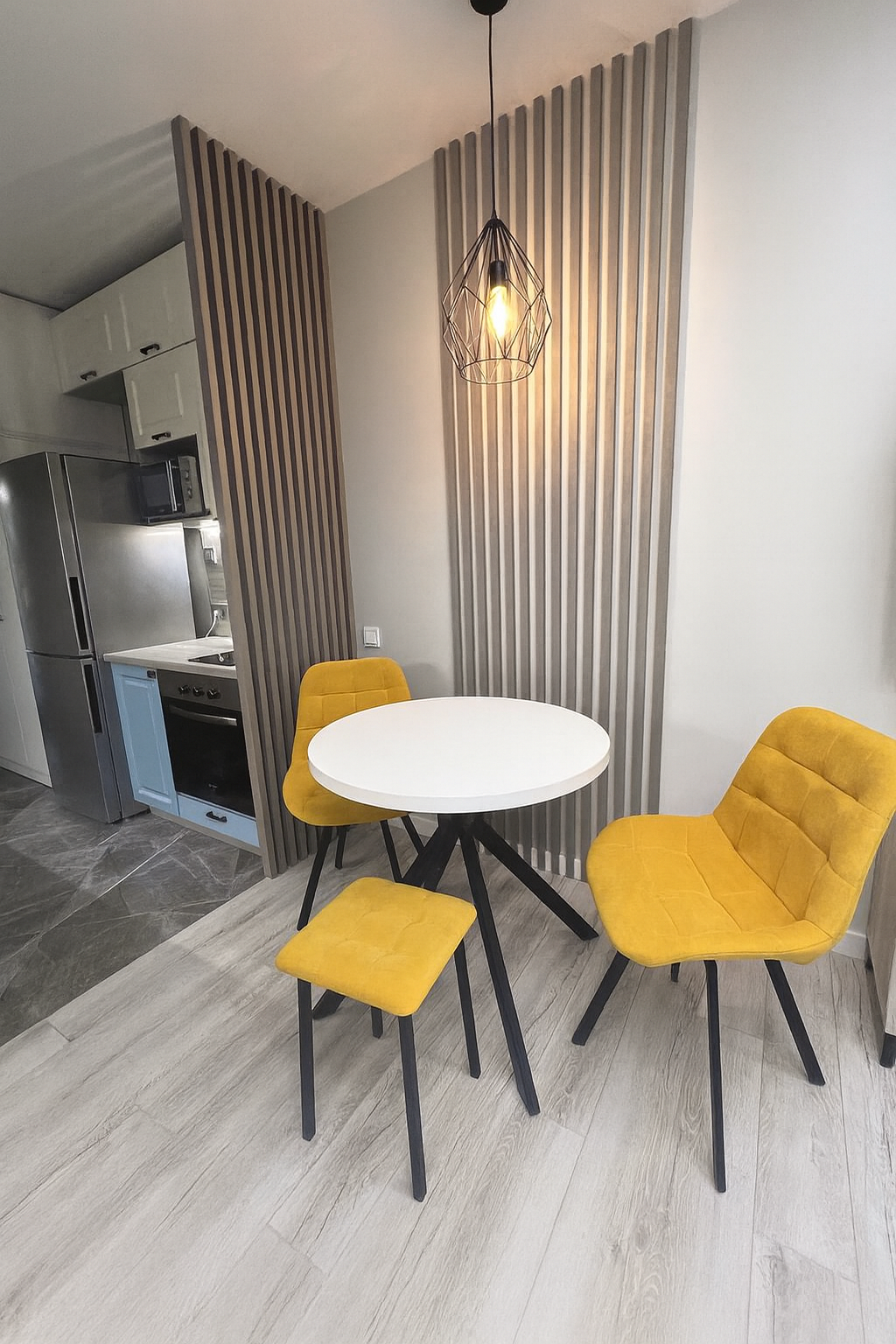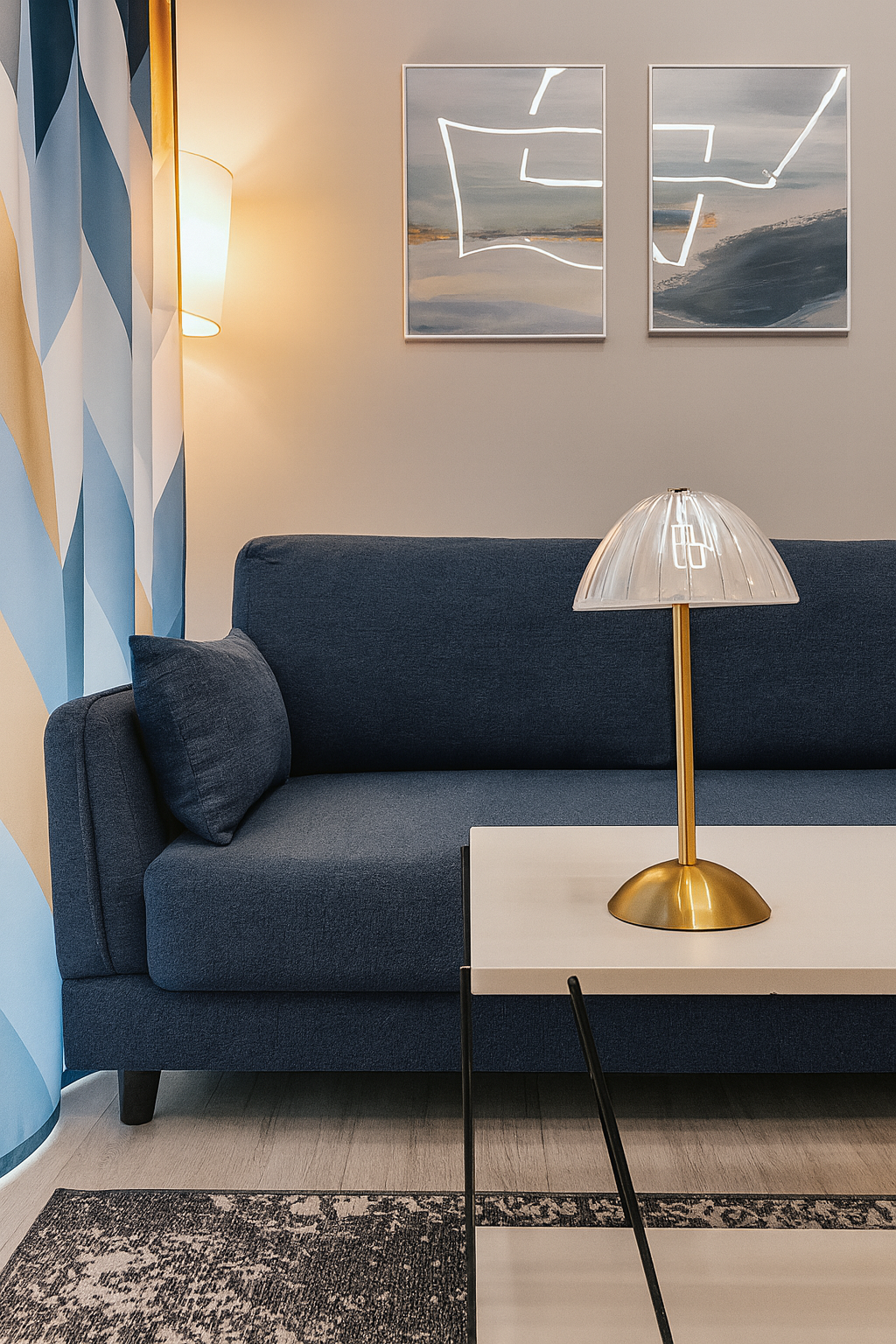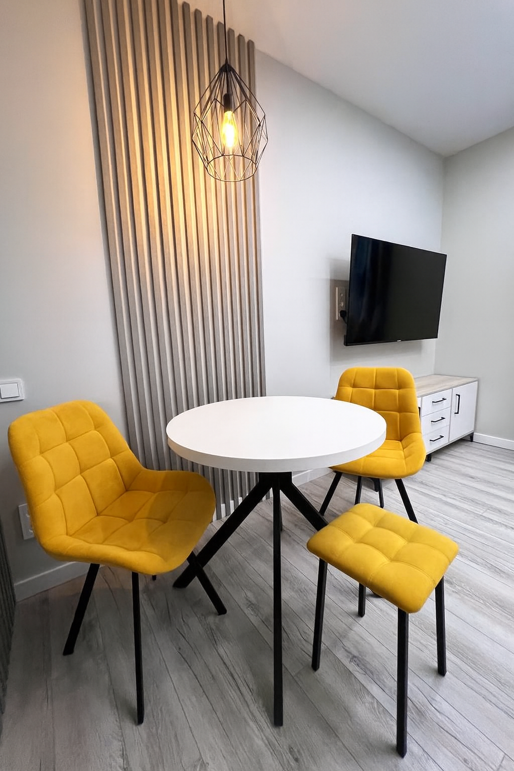 Квартира рассчитана на комфортное проживание до 4 гостей. В спальной зоне — мягкая двуспальная кровать для крепкого сна, а в гостиной — удобный раскладной диван. Интерьер выполнен в современном стиле — гармоничные оттенки, дизайнерское освещение, яркие акценты в текстиле и уютная атмосфера.