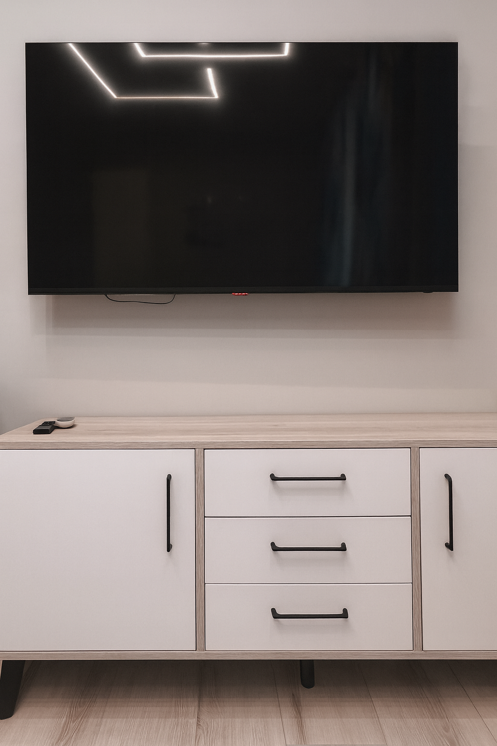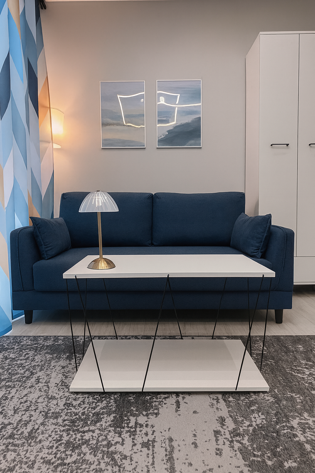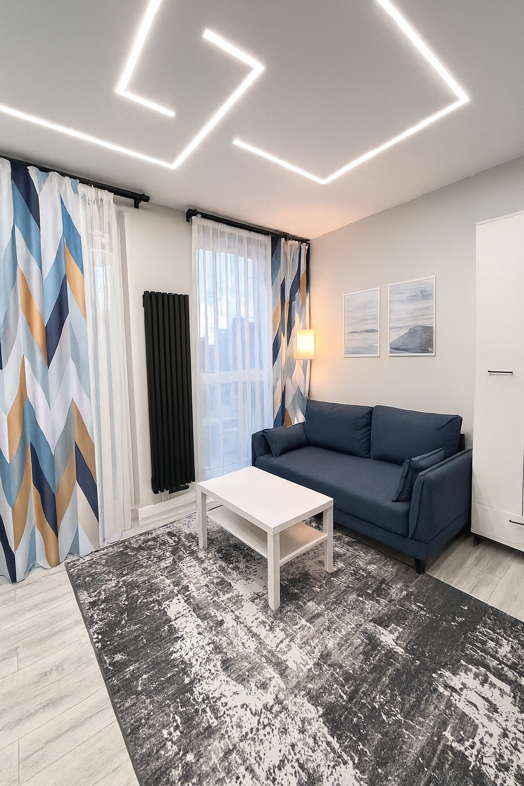 Квартира рассчитана на комфортное проживание до 4 гостей. В спальной зоне — мягкая двуспальная кровать для крепкого сна, а в гостиной — удобный раскладной диван. Интерьер выполнен в современном стиле — гармоничные оттенки, дизайнерское освещение, яркие акценты в текстиле и уютная атмосфера.