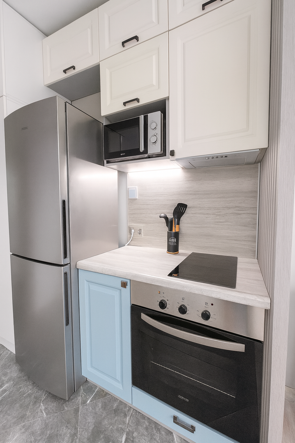 На кухне есть все необходимое для приготовления домашних блюд — варочная панель, духовка, микроволновая печь, электрочайник, полный набор посуды и кухонных принадлежностей.