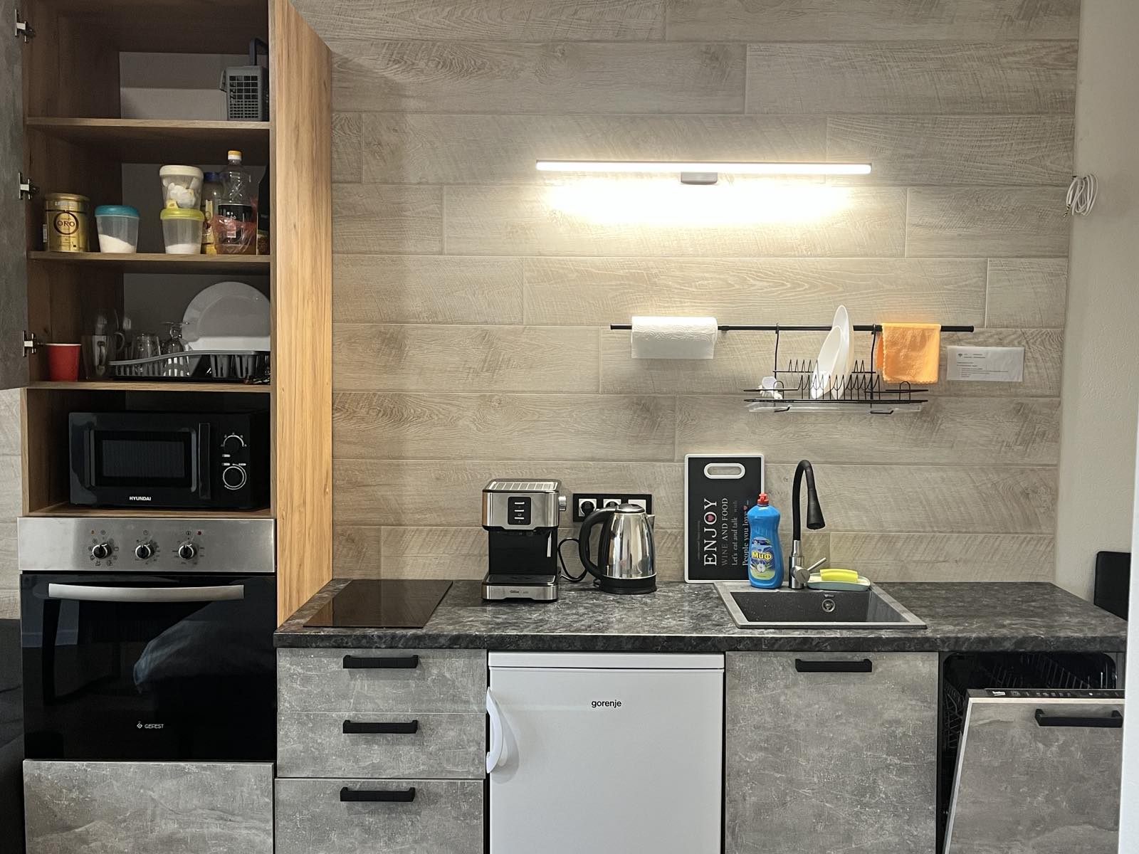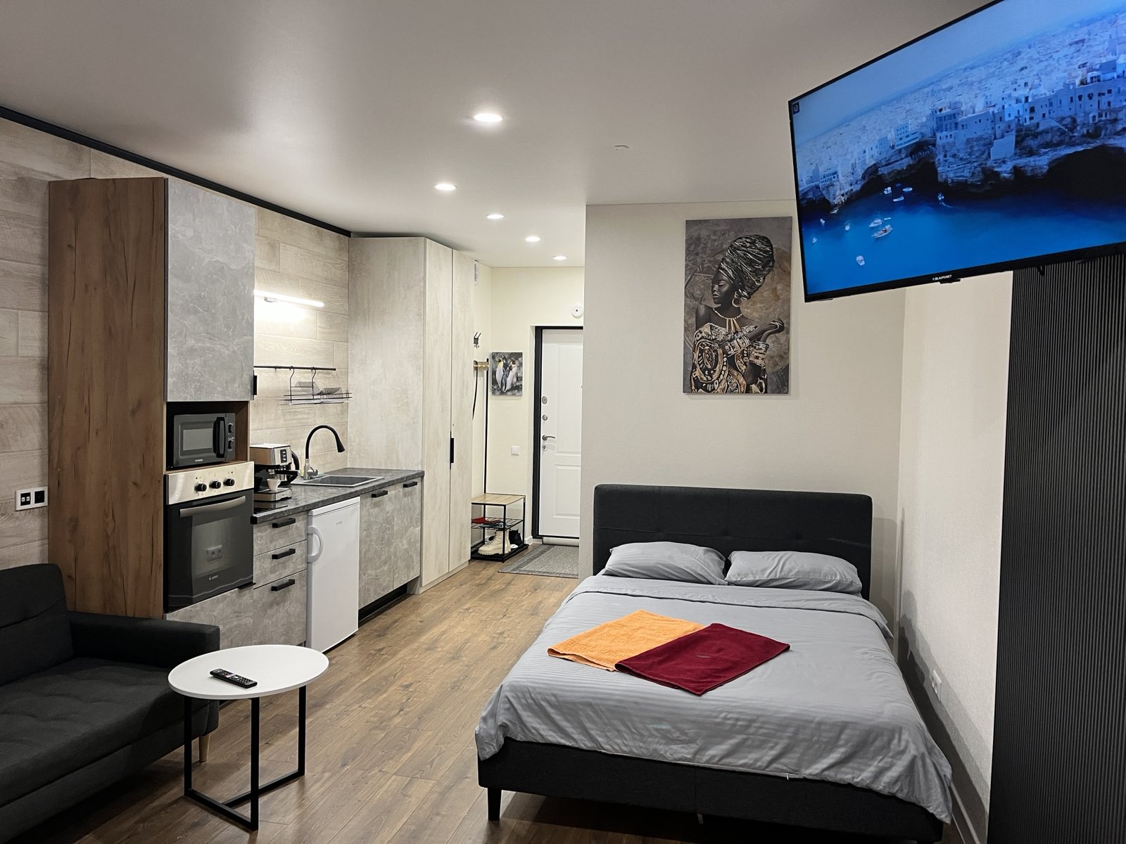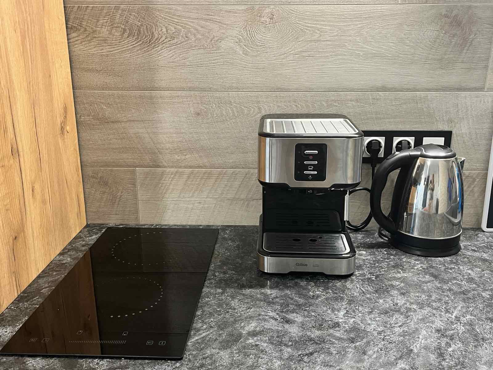 Двухспальная кровать с ортопедическим матрасом премиум класса, телевизор диагональю 43 с андроид системой, стиральная и посудомоечная машины, кофемашина.