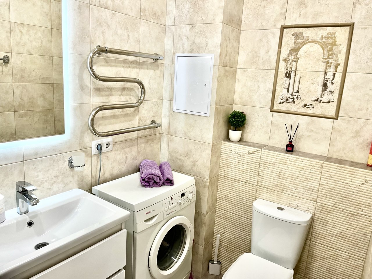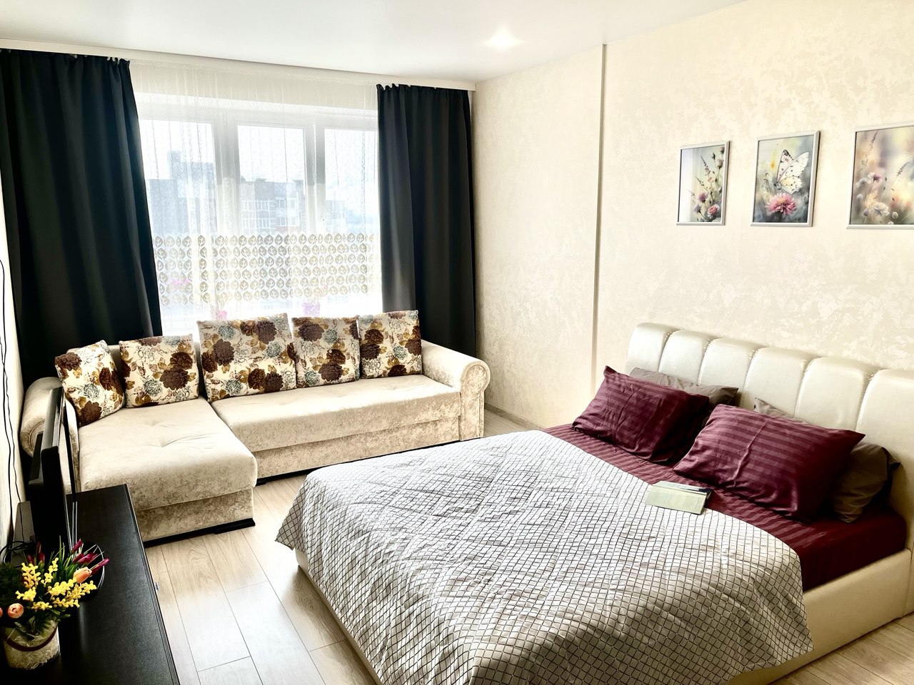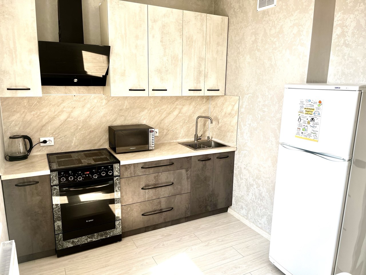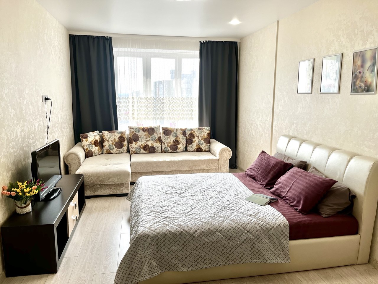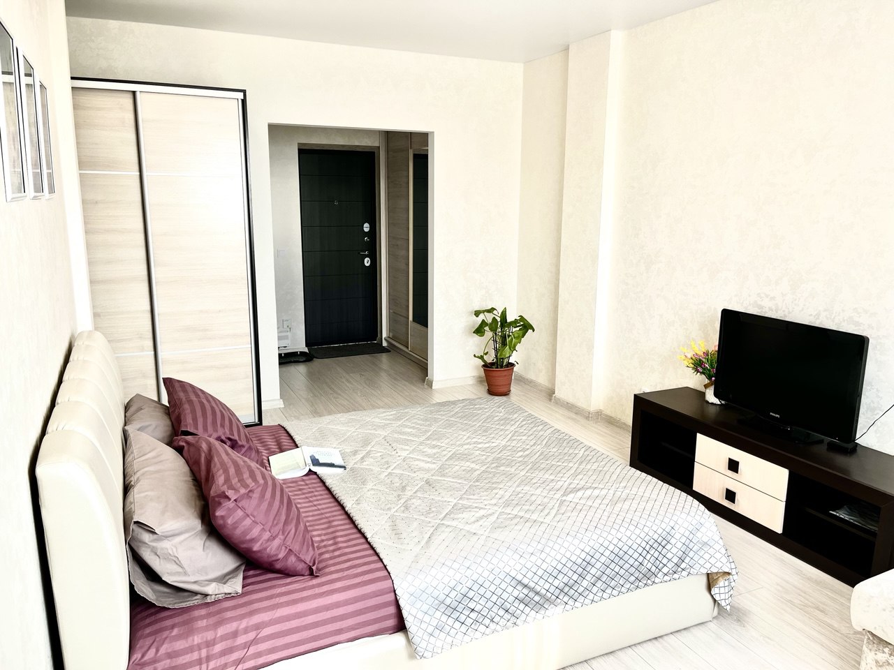 Жилая комната и кухня полностью оборудованы для комфортного проживания: мебель, бытовая техника, Smart TV, быстрый интернет.
