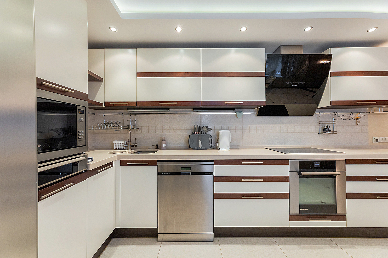 Кухонная зона оборудована варочной панелью, посудомоечной машиной, свч печь, духовой шкаф, встроенный холодильник и всей необходимой посудой.