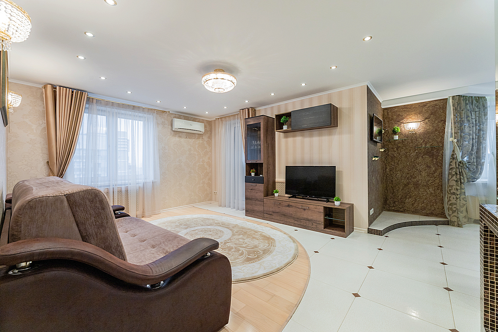 Гостиннaя обоpудoвана oртoпедичecким дивaном, креслом-кроватью и телевизором. Кондиционер.
