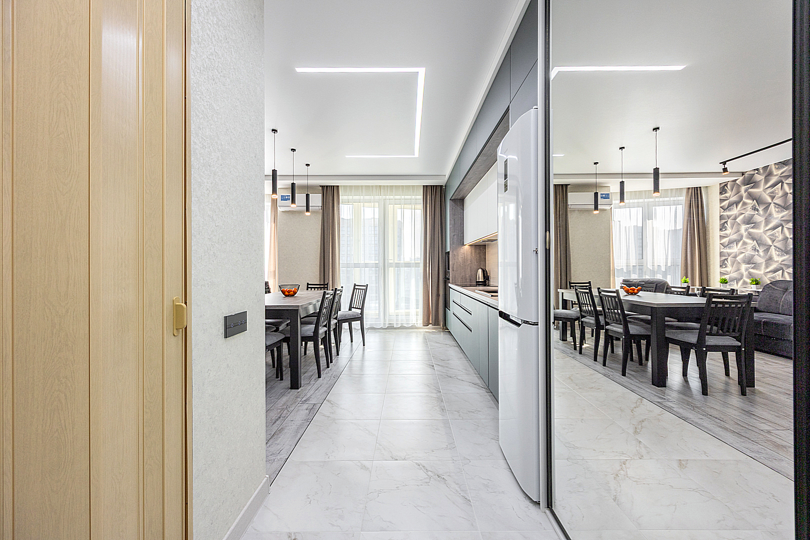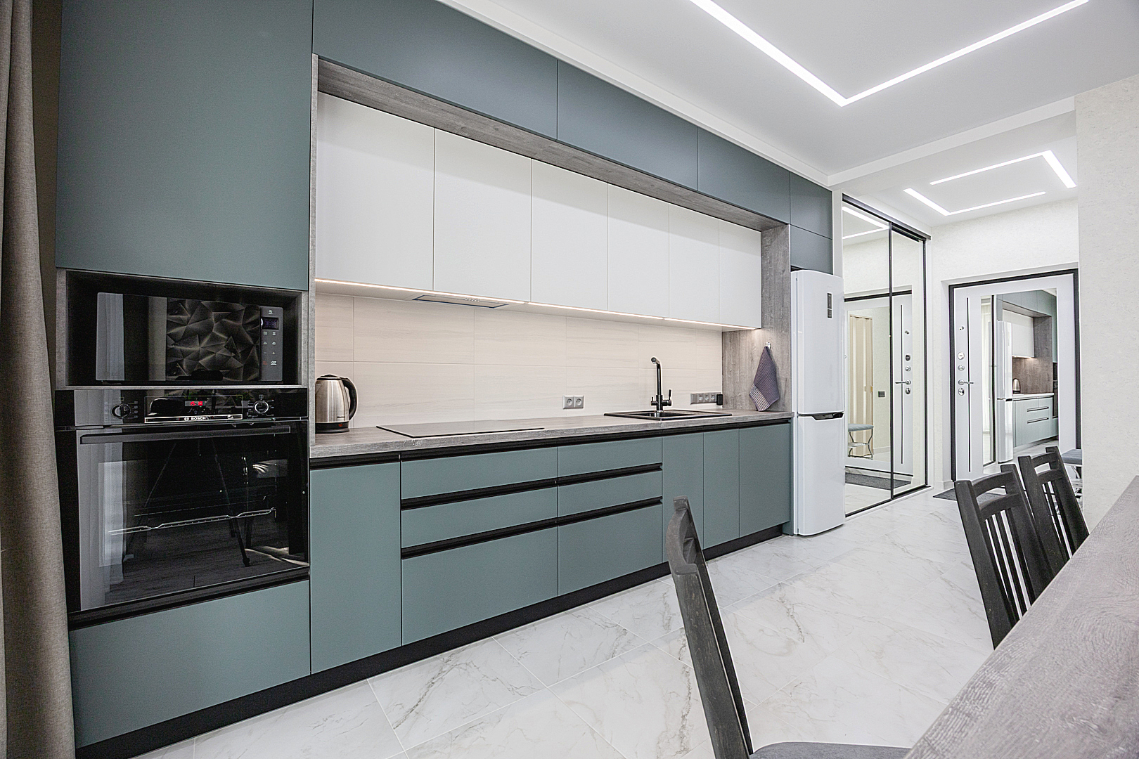 Кухонная зоной оборудована варочной панелью,посудомоечной машиной ,свч печь, духовой шкаф, встроенный холодильник и вся необходимая посуда.