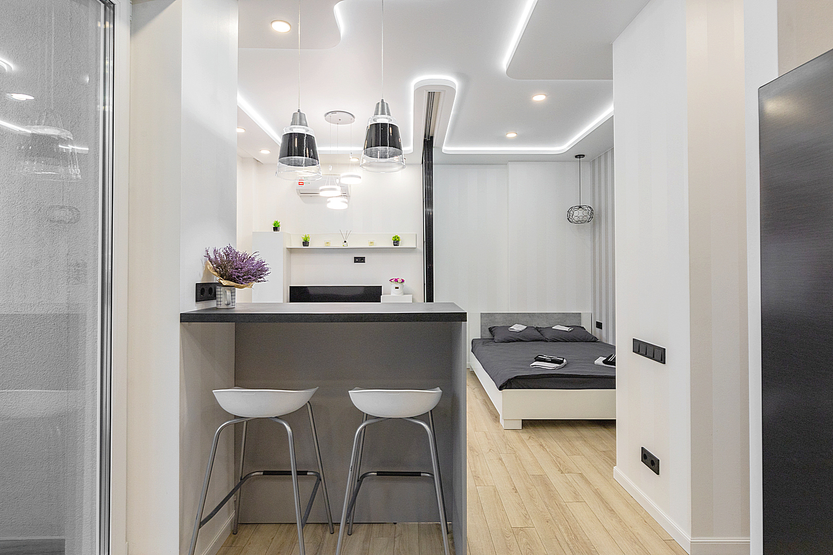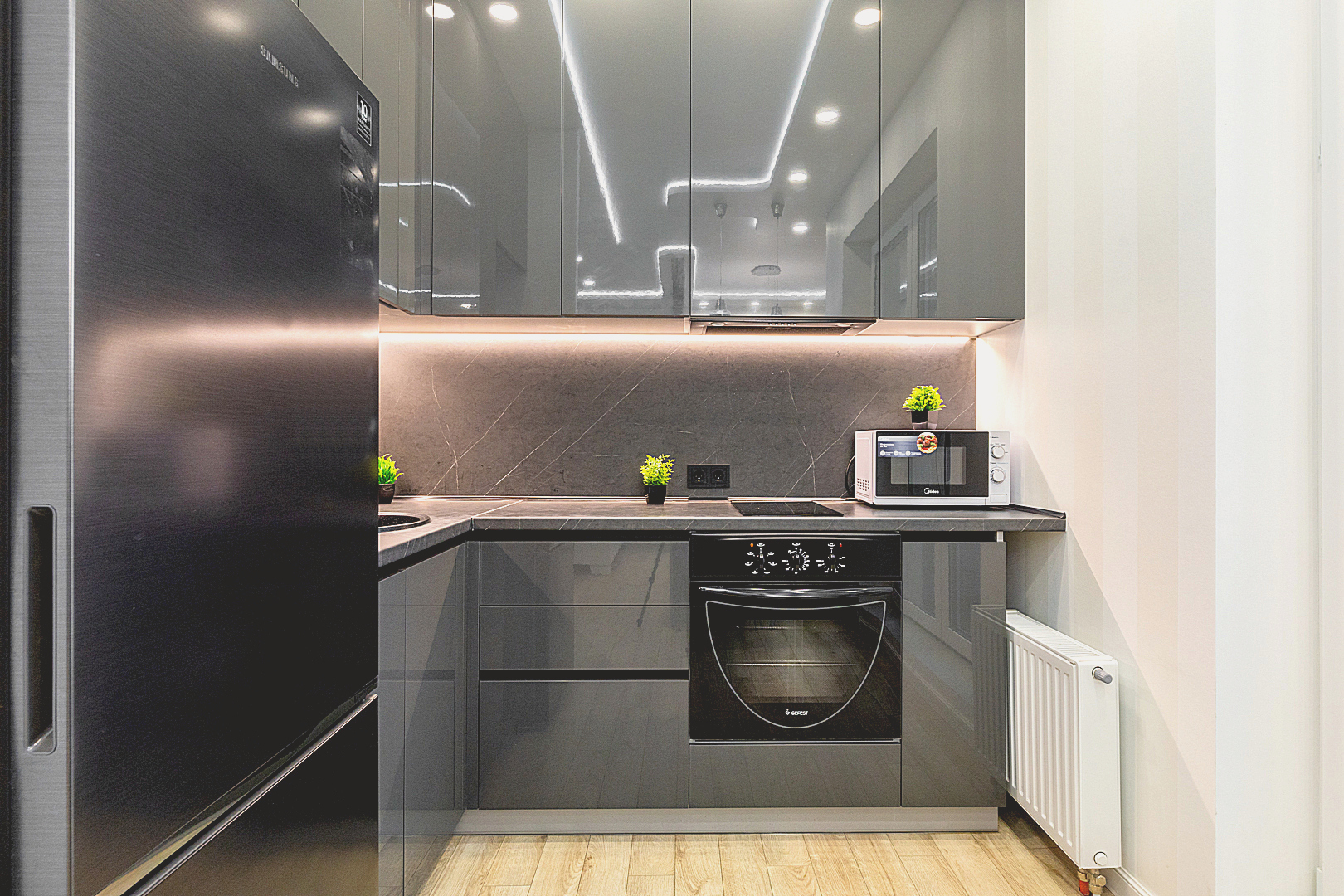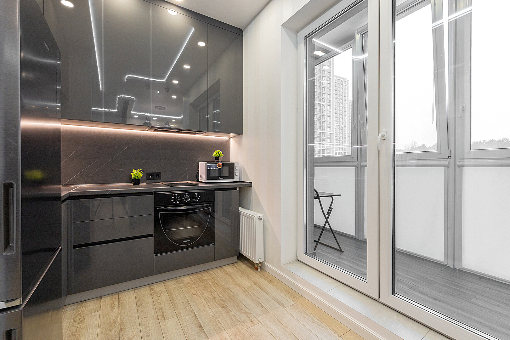 Кухонная зона оборудована варочной панелью, свч печью, духовым шкафом, встроенным холодильником, чайником и всей необходимой посудой.