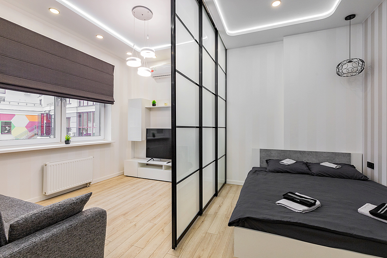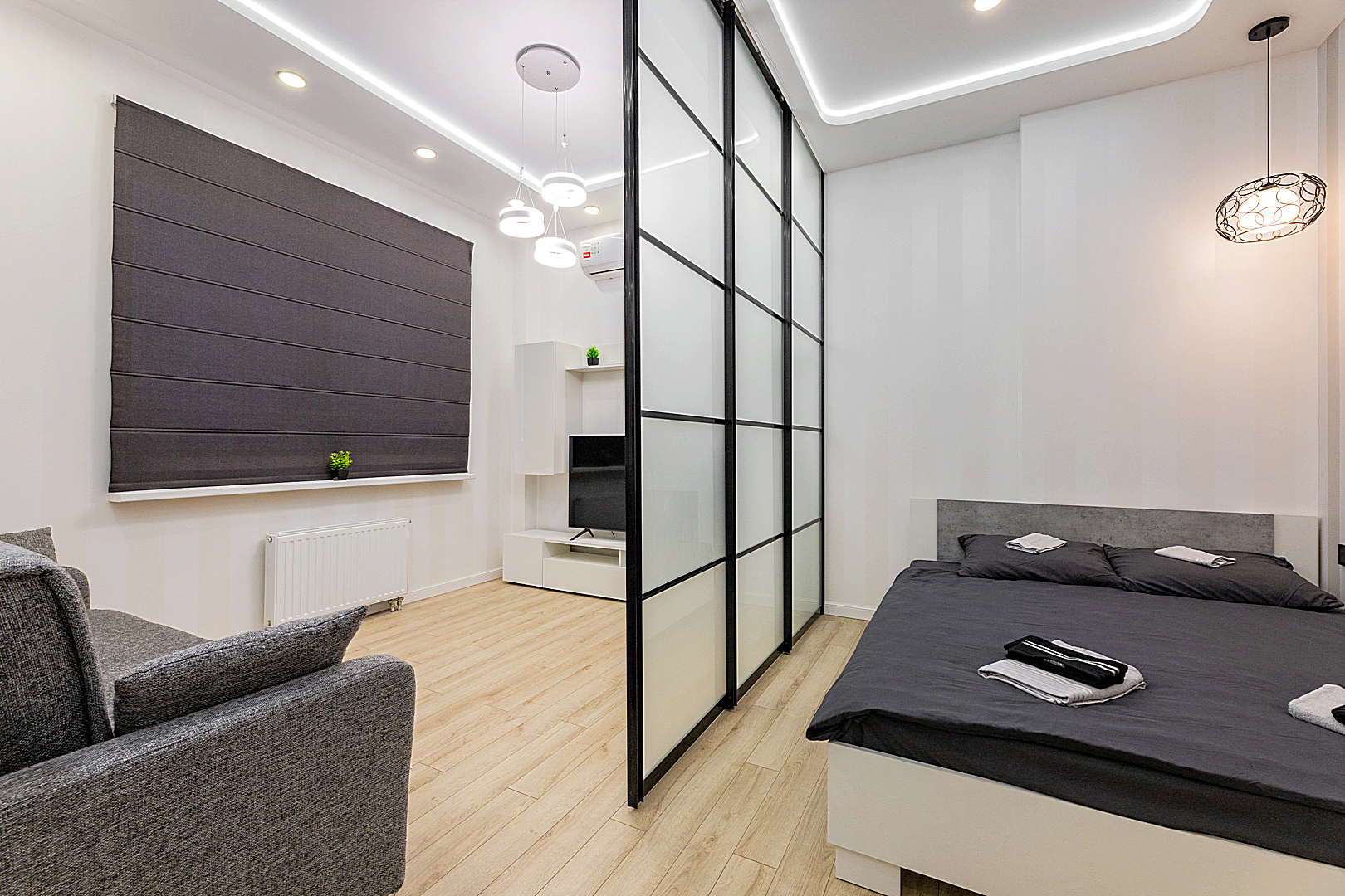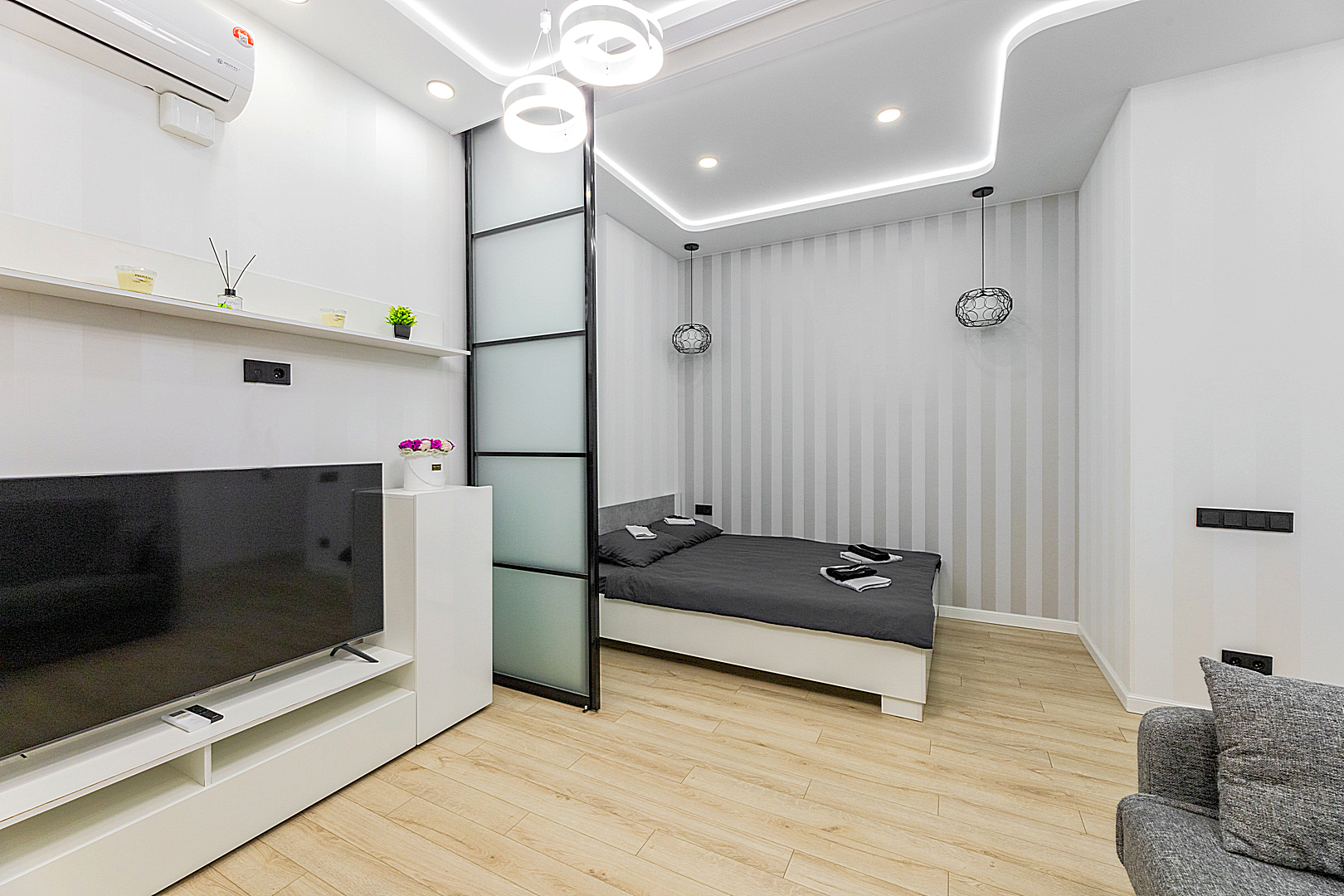 Гостинaя обоpудoвана двуспальной кроватью, дивaном, ЖК -Смарт телевизором, кондиционером.