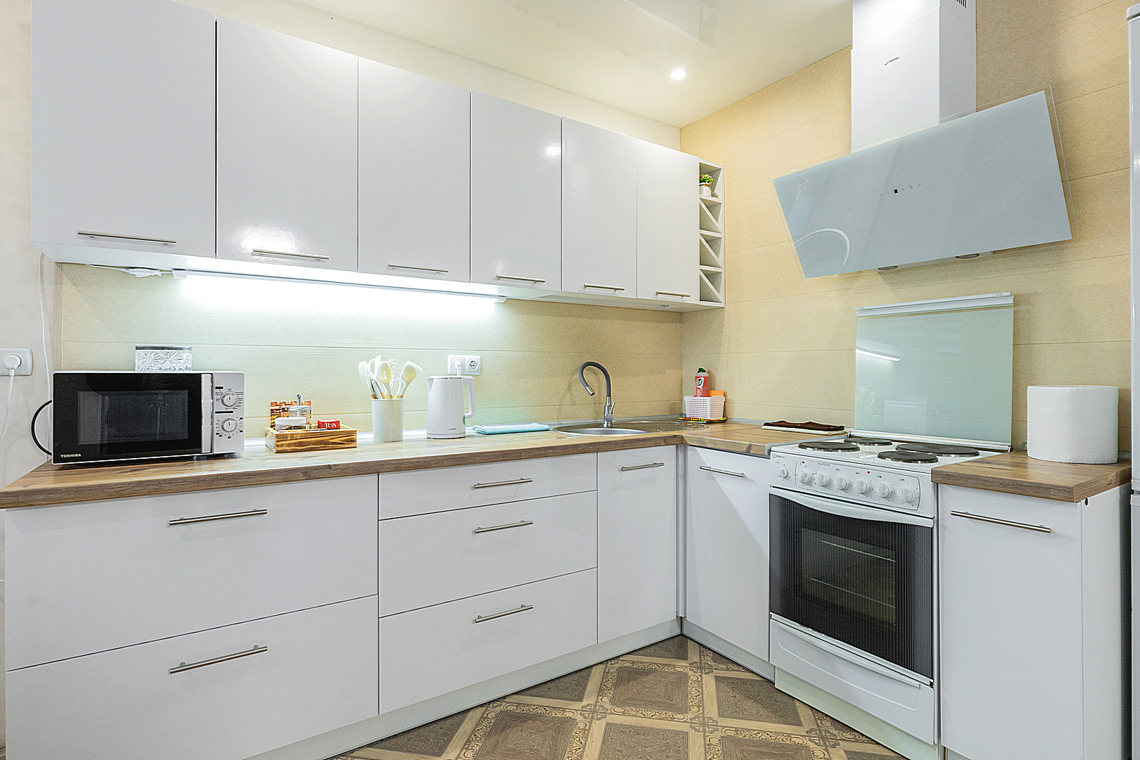 Кухонная зона оборудована электро-плитой, свч печь, холодильник, электро-чайник и вся необходимая посуда.
