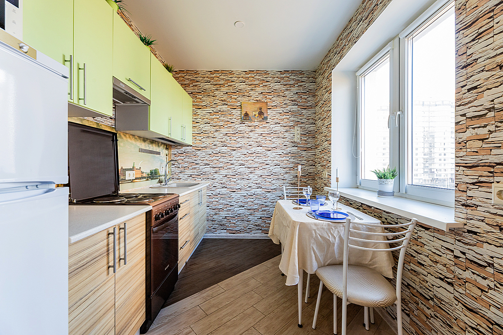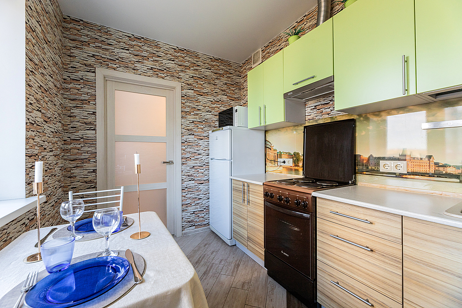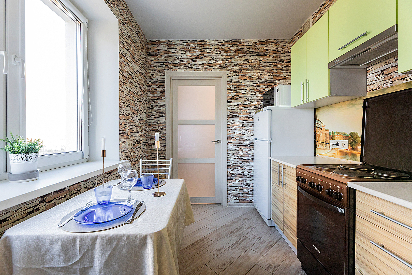 Кухонная зоной оборудована плитой, свч печь, холодильник и вся необходимая посуда.