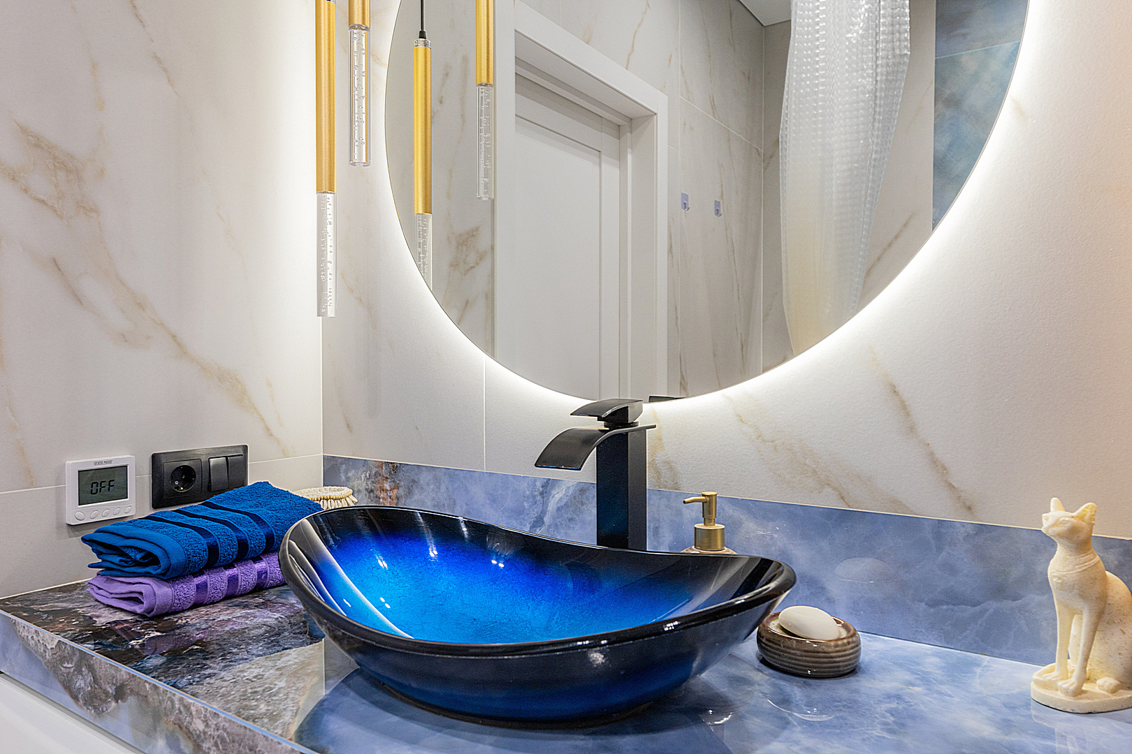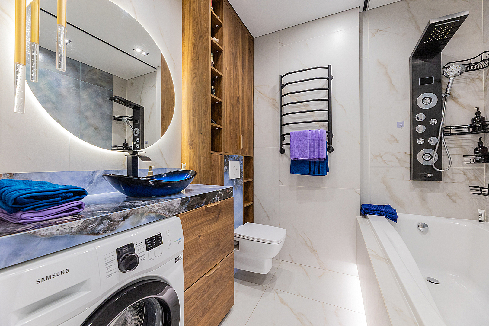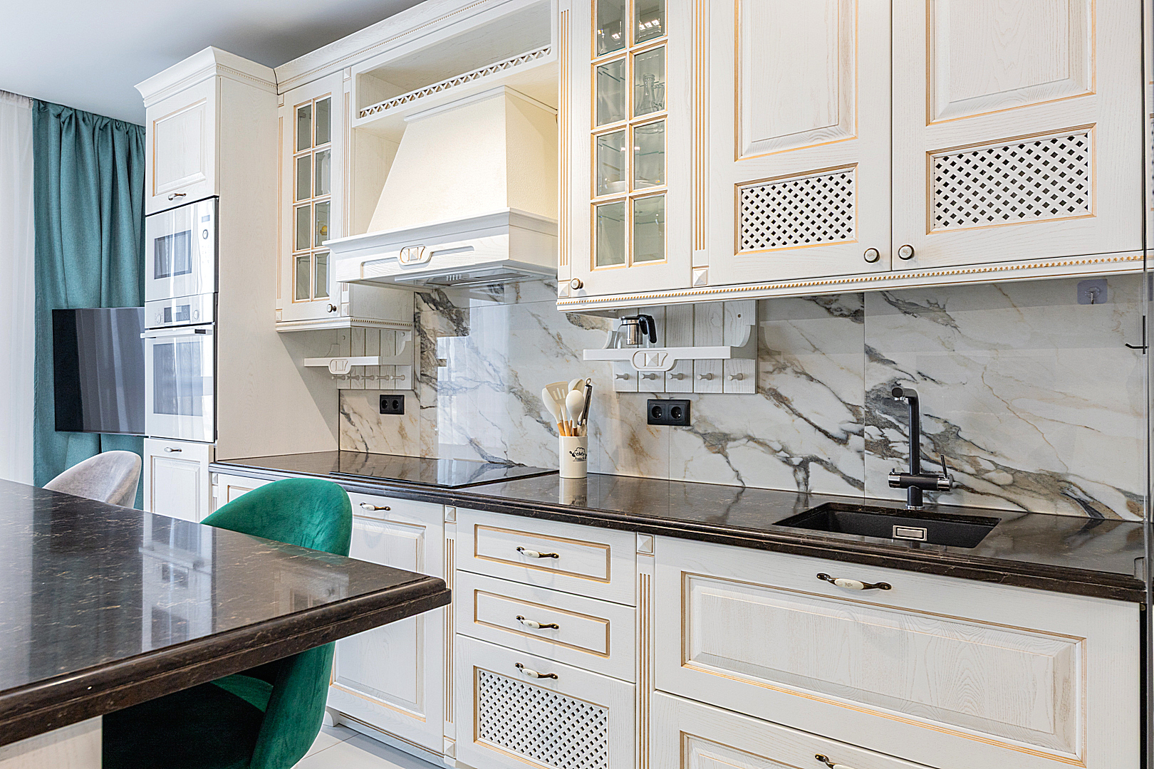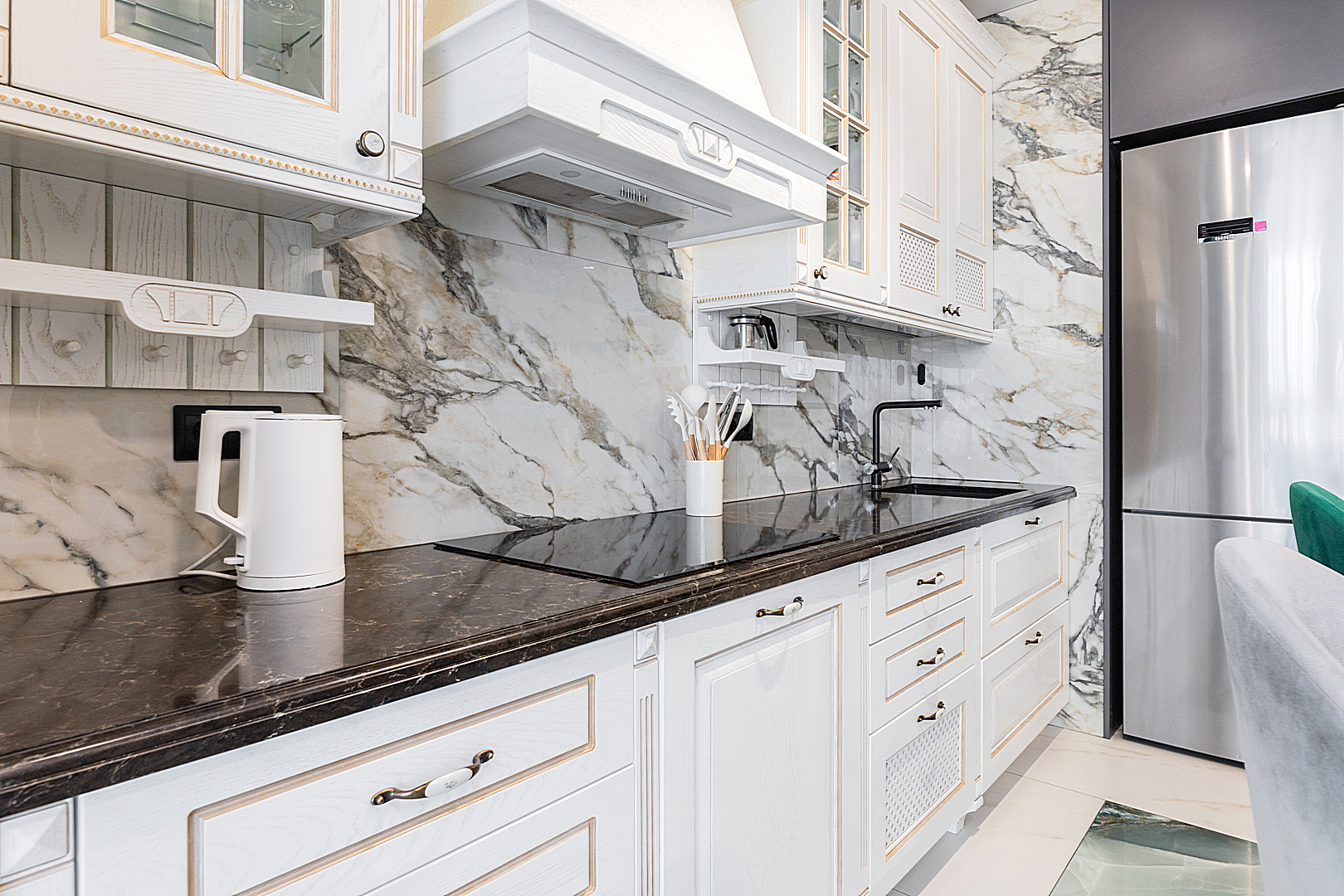 Кухонная зона оборудована варочной панелью, посудомоечной машиной, СВЧ-печью, духовым шкафом, встроенным холодильником и всей необходимой посудой.