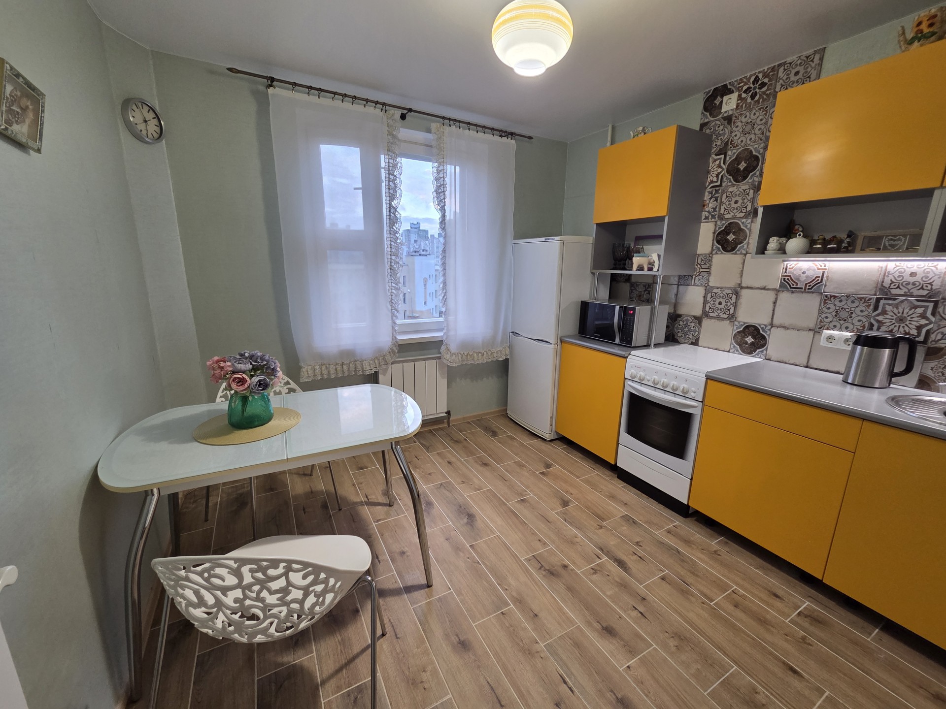 ✔️ Кухня с обеденной зоной: плита, духовой шкаф, холодильник, СВЧ, чайник, посуда, приборы.