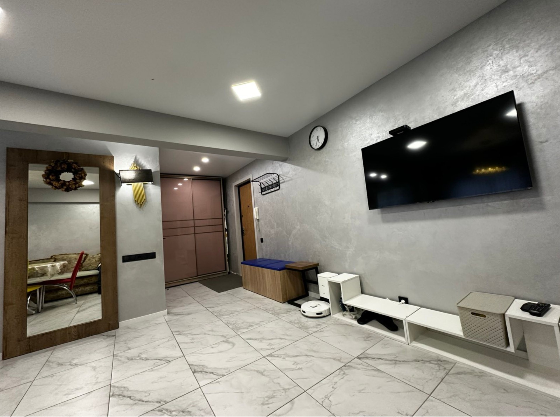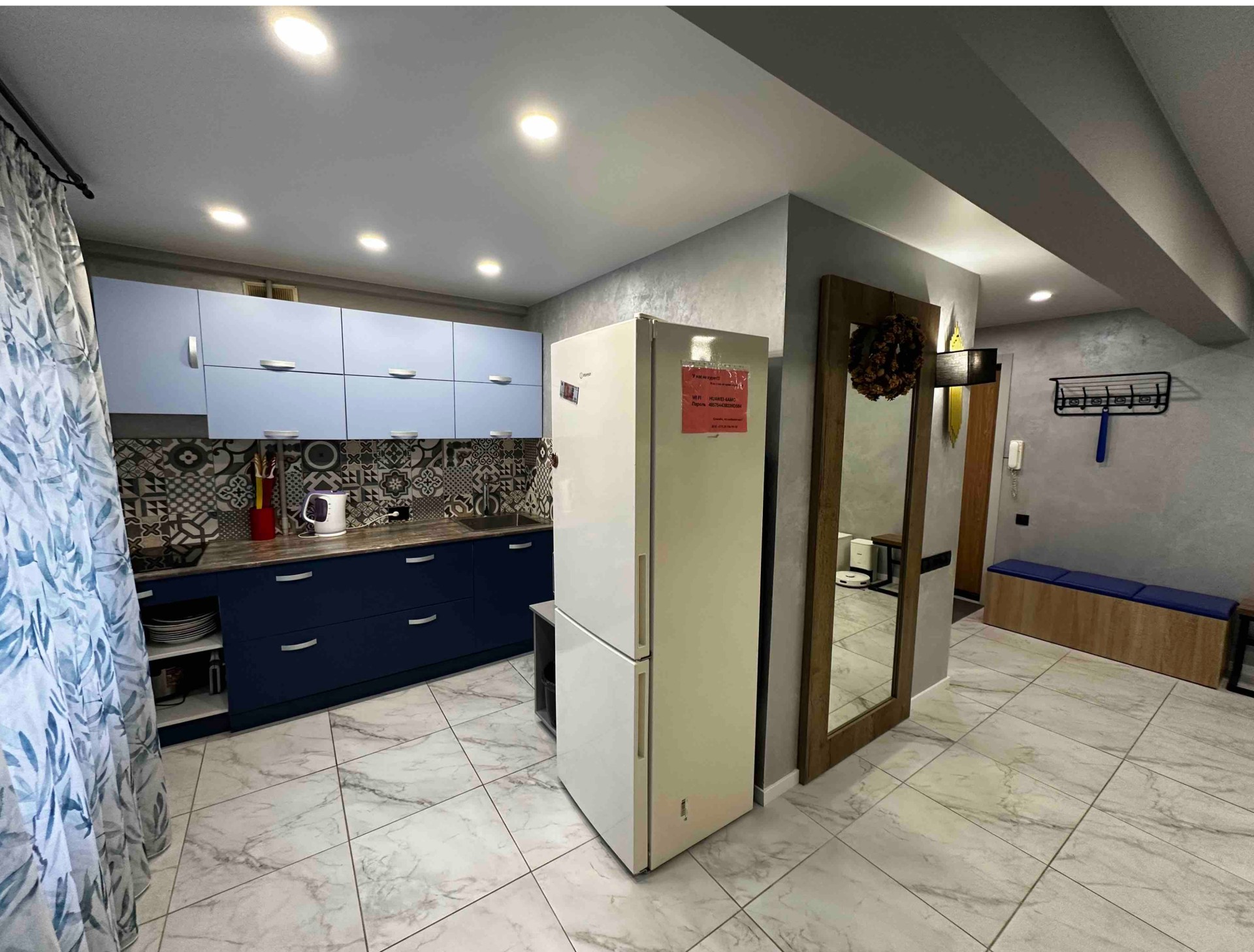 Техника ( большой телевизора, стиральная машина, варочная панель, холодильник, микроволновая печь, электрочайник, фен, утюг, гладильная доска).