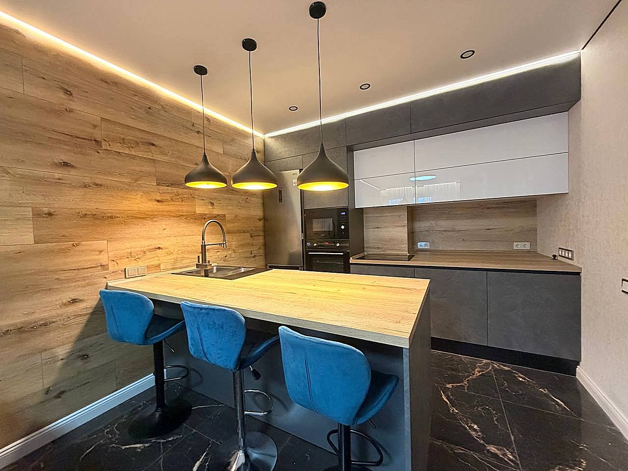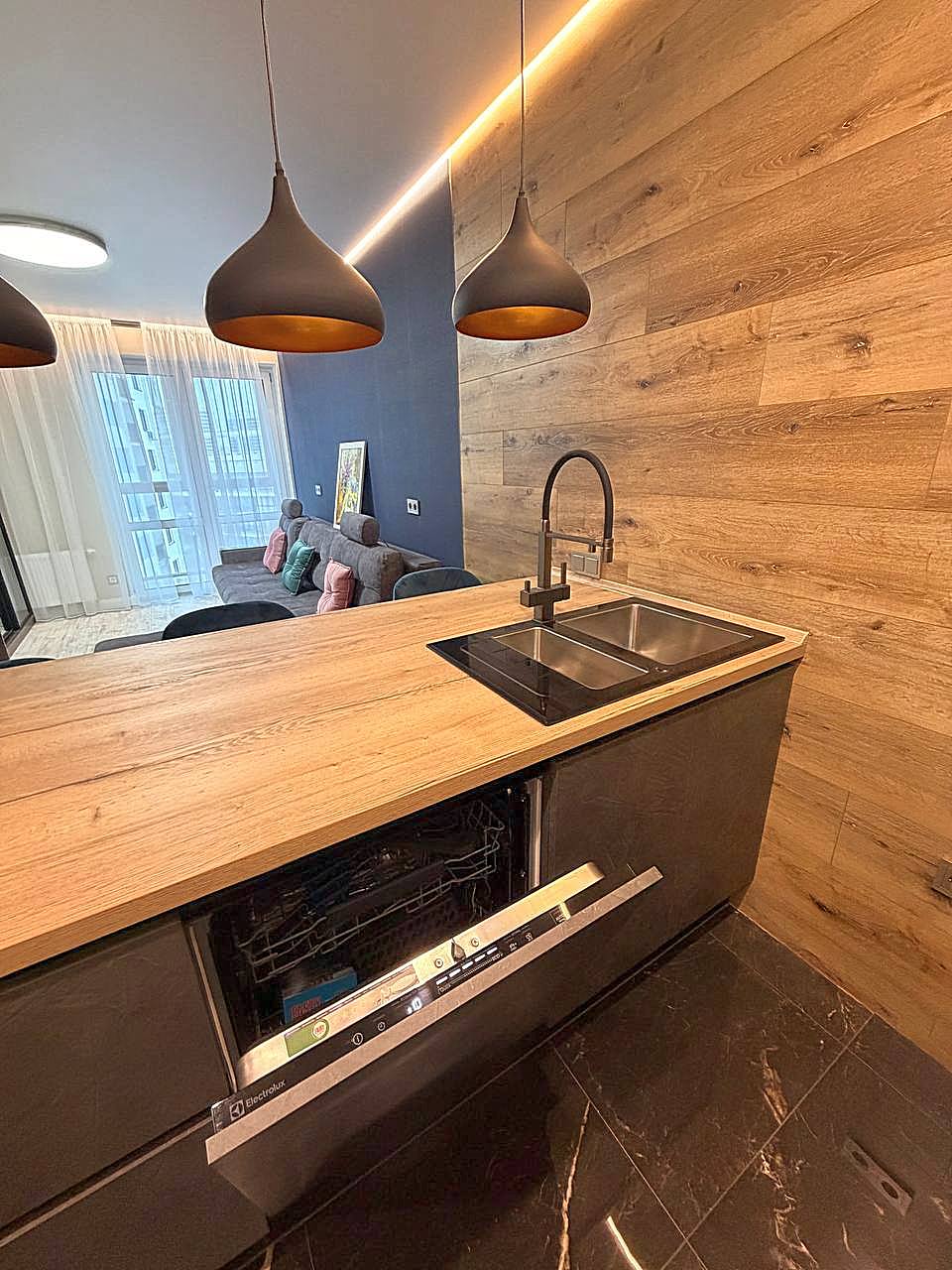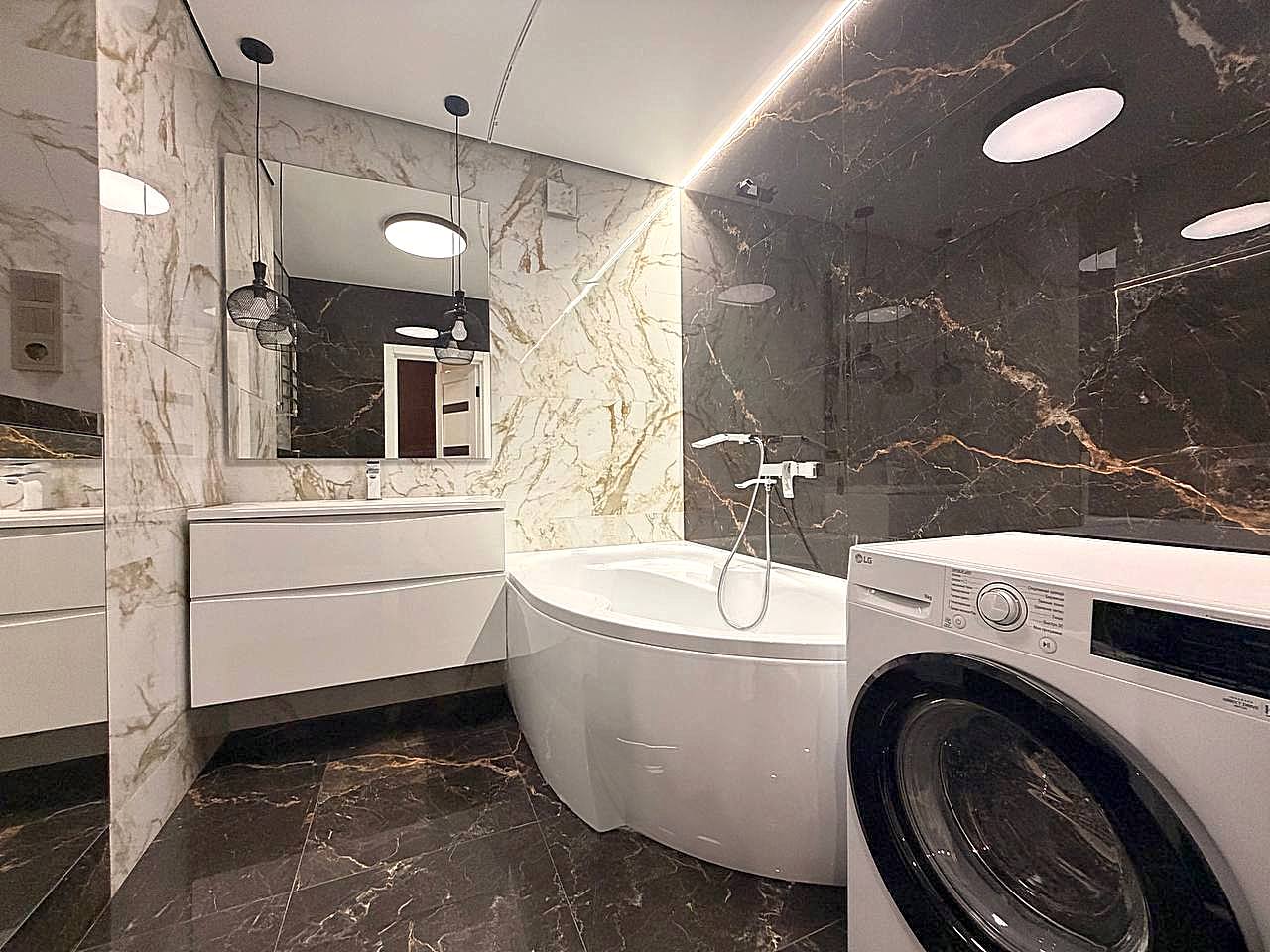 Кухонная зона оборудована варочной панелью, посудомоечной машиной, СВЧ-печью, духовым шкафом, встроенным холодильником и всей необходимой посудой.