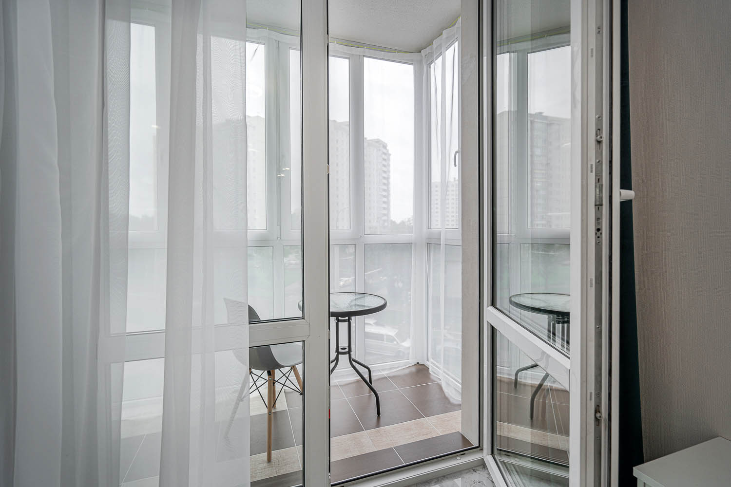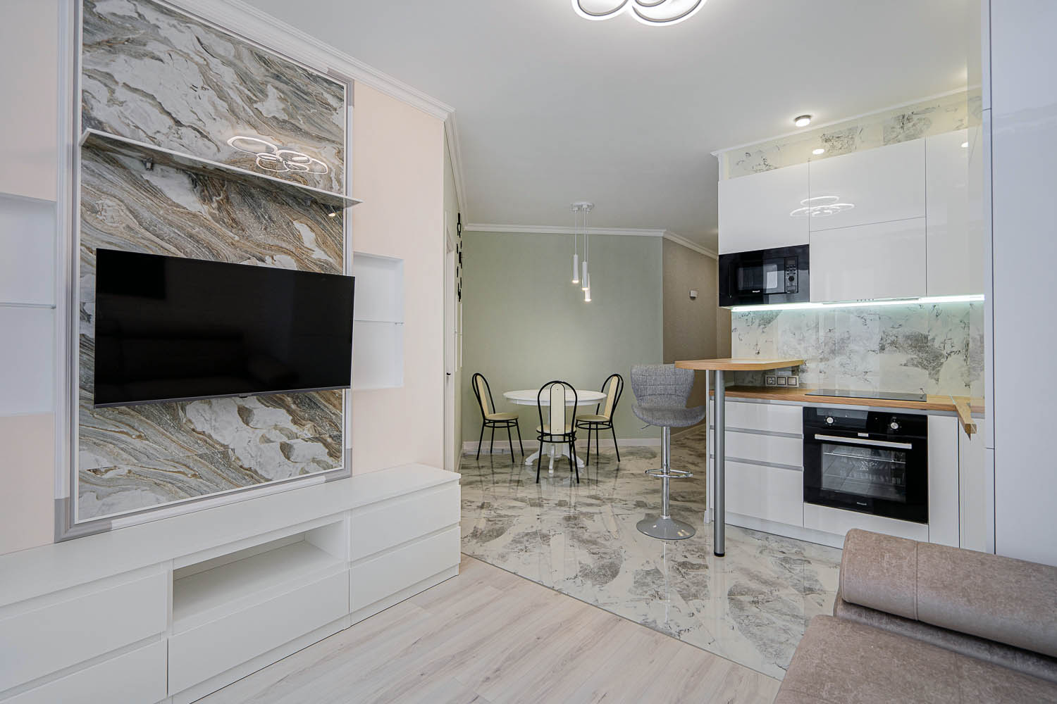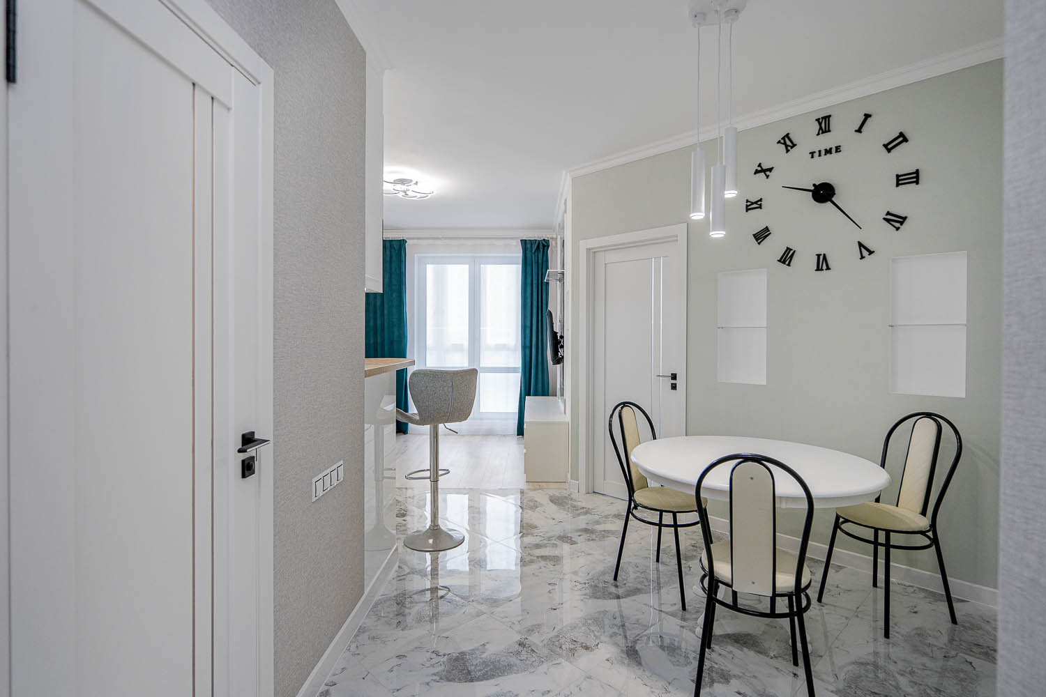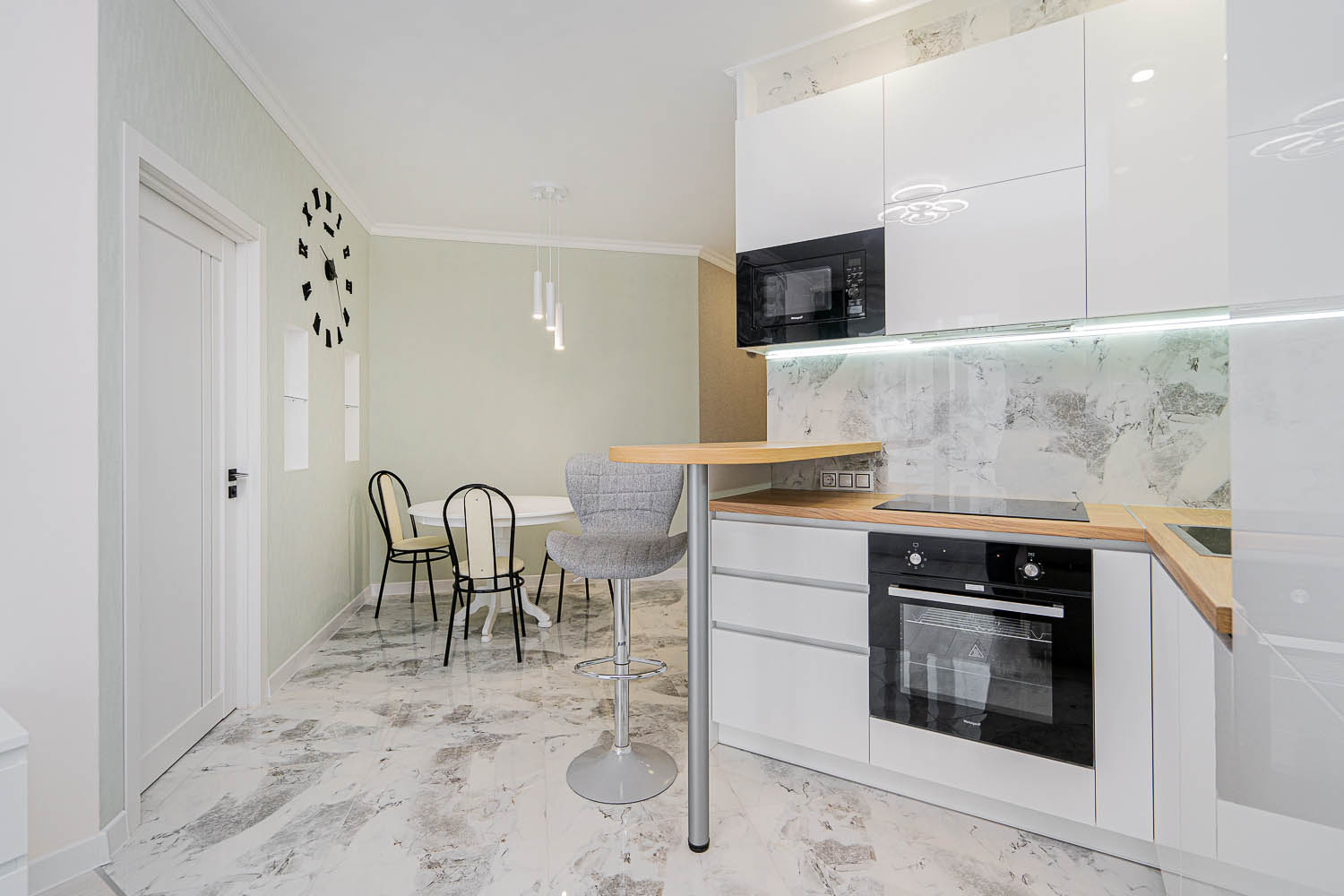 Кухня выполнена в современном стиле и включает все необходимое для проживания: обеденный стол для комфортных ужинов и барную стойку для быстрого завтрака. Кроме того, из квартиры есть выход на большой уютный балкон, где приятно провести время за чашкой кофе или насладиться вечерним воздухом.