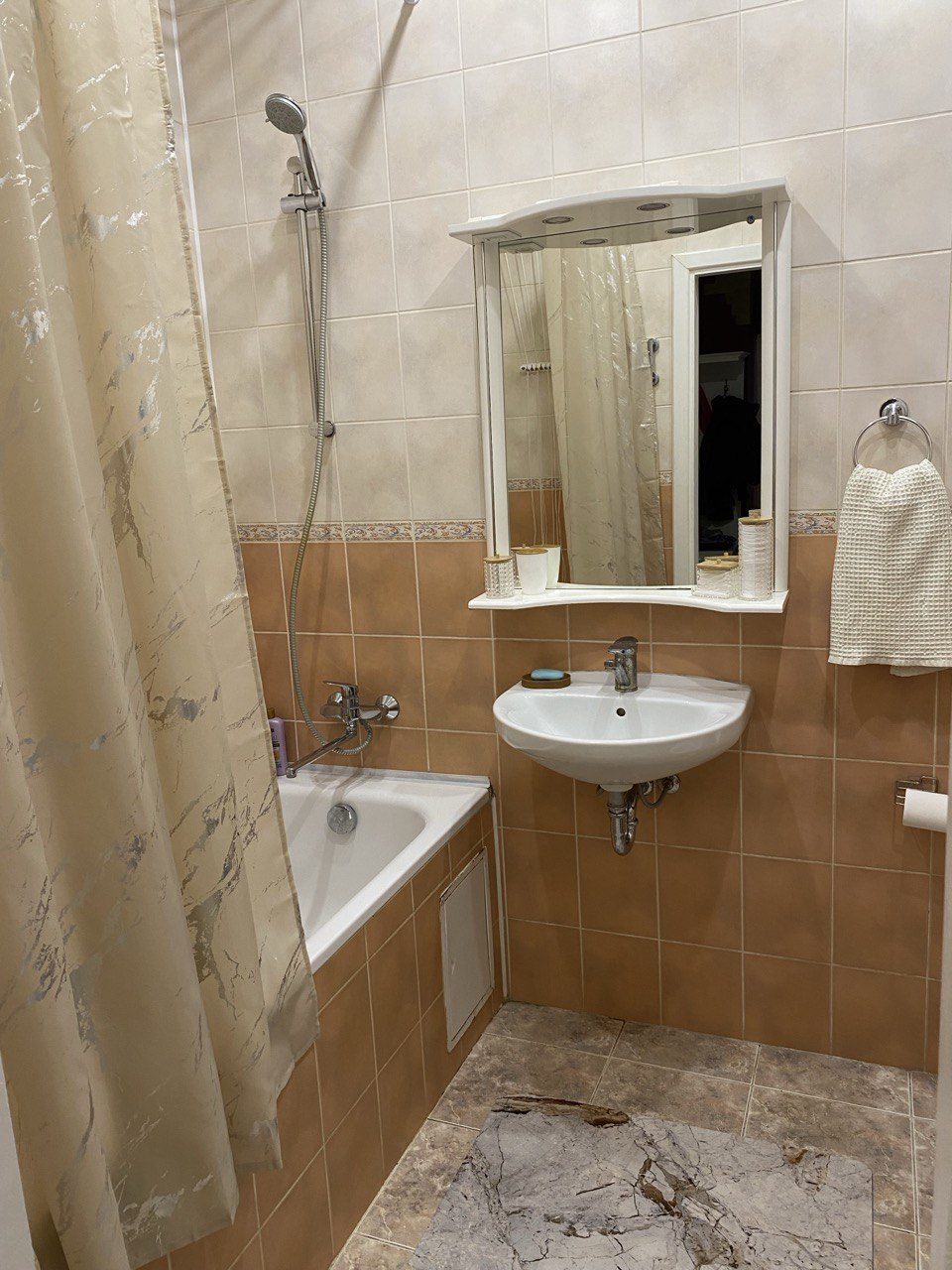 Кухня со встроенной мебелью и бытовой техникой (варочная поверхность, духовой шкаф, вытяжка), просторная ванная комната.