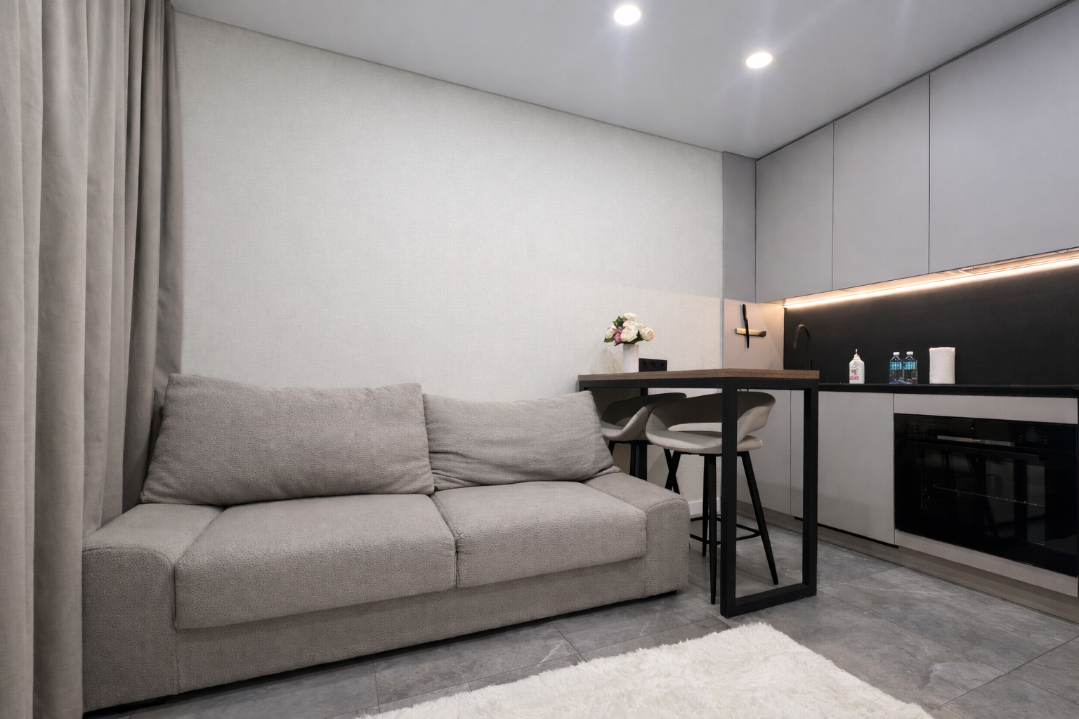 А в гостиной зоне очень мягкий диван, в который буквально проваливаешься, как в облако. На нем приятно и сидеть, и отдыхать, и смотреть фильм вечером после насыщенного дня.