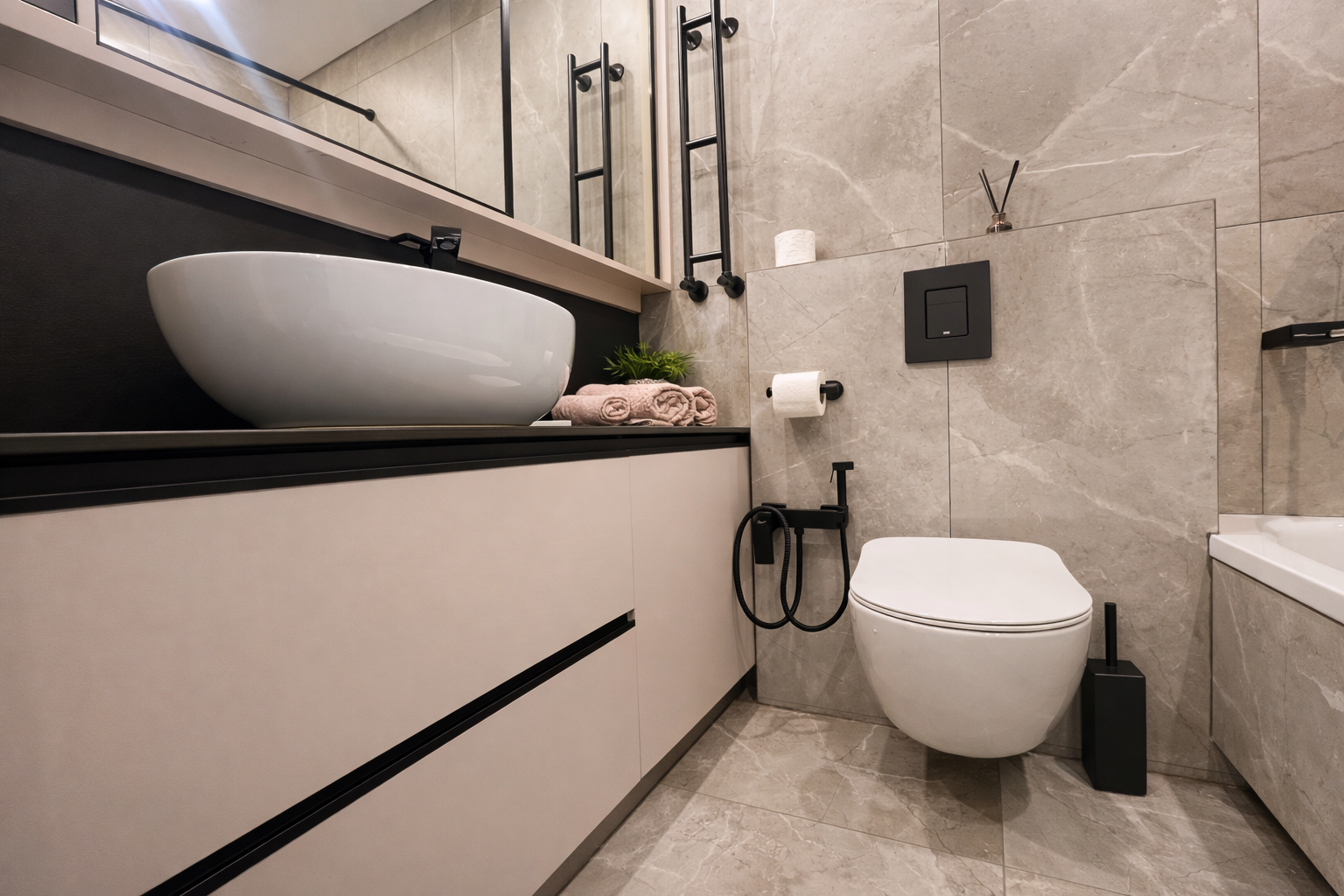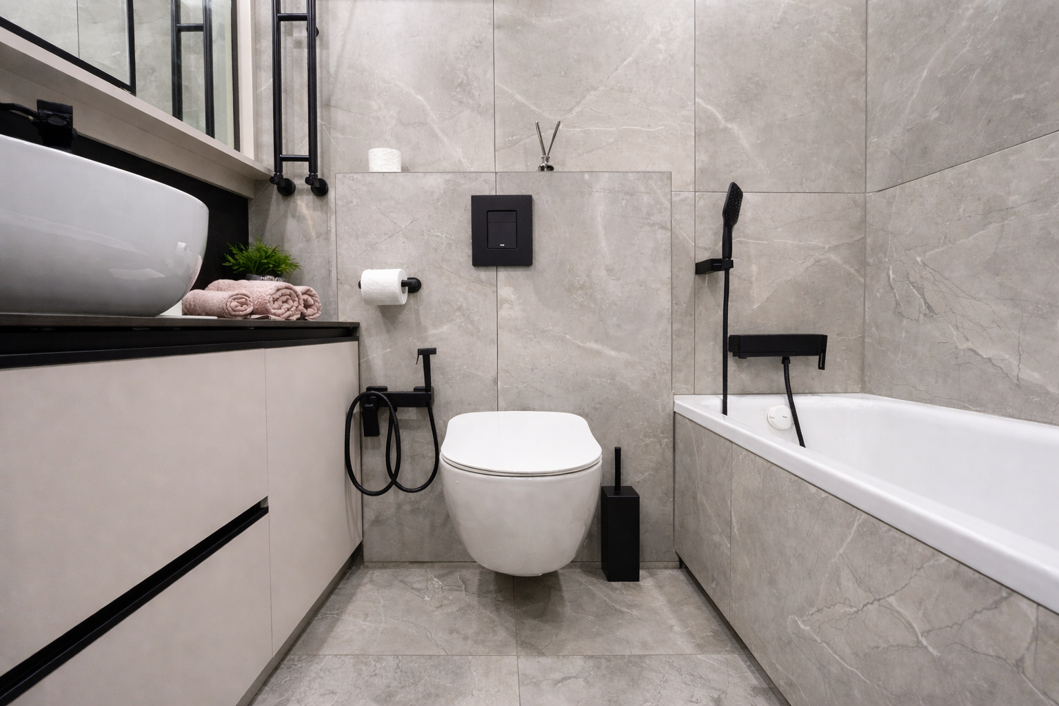 Ванная комната. Светлая, чистая, современная ванная комната с полноценной ванной: