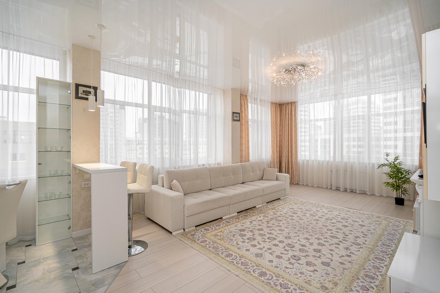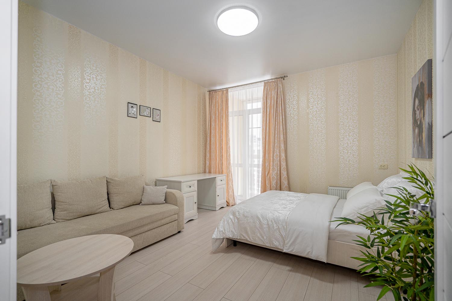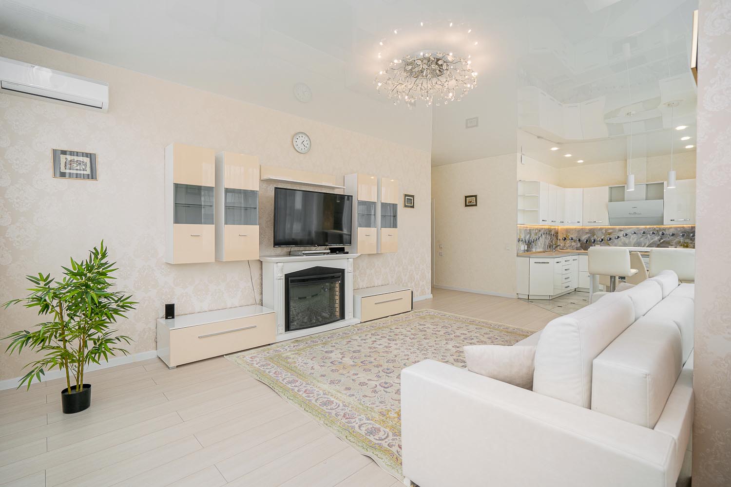 Светлая и уютная трехкомнатная квартира расположена в современном ЖК «Маяк», на улице Петра Мстиславца, 20. Просторная квартира располагает двумя отдельными спальнями, кухня-гостиная с раскладным диваном, камином и большим телевизором, что обеспечивает комфорт и уединение для гостей.