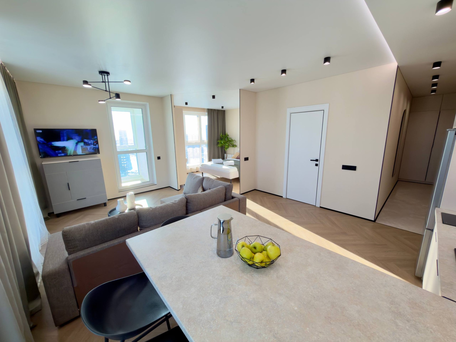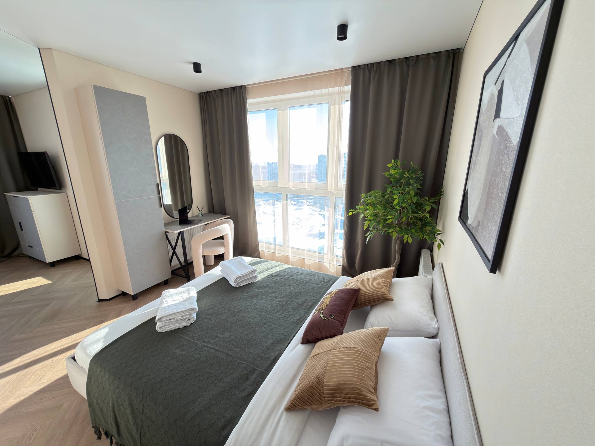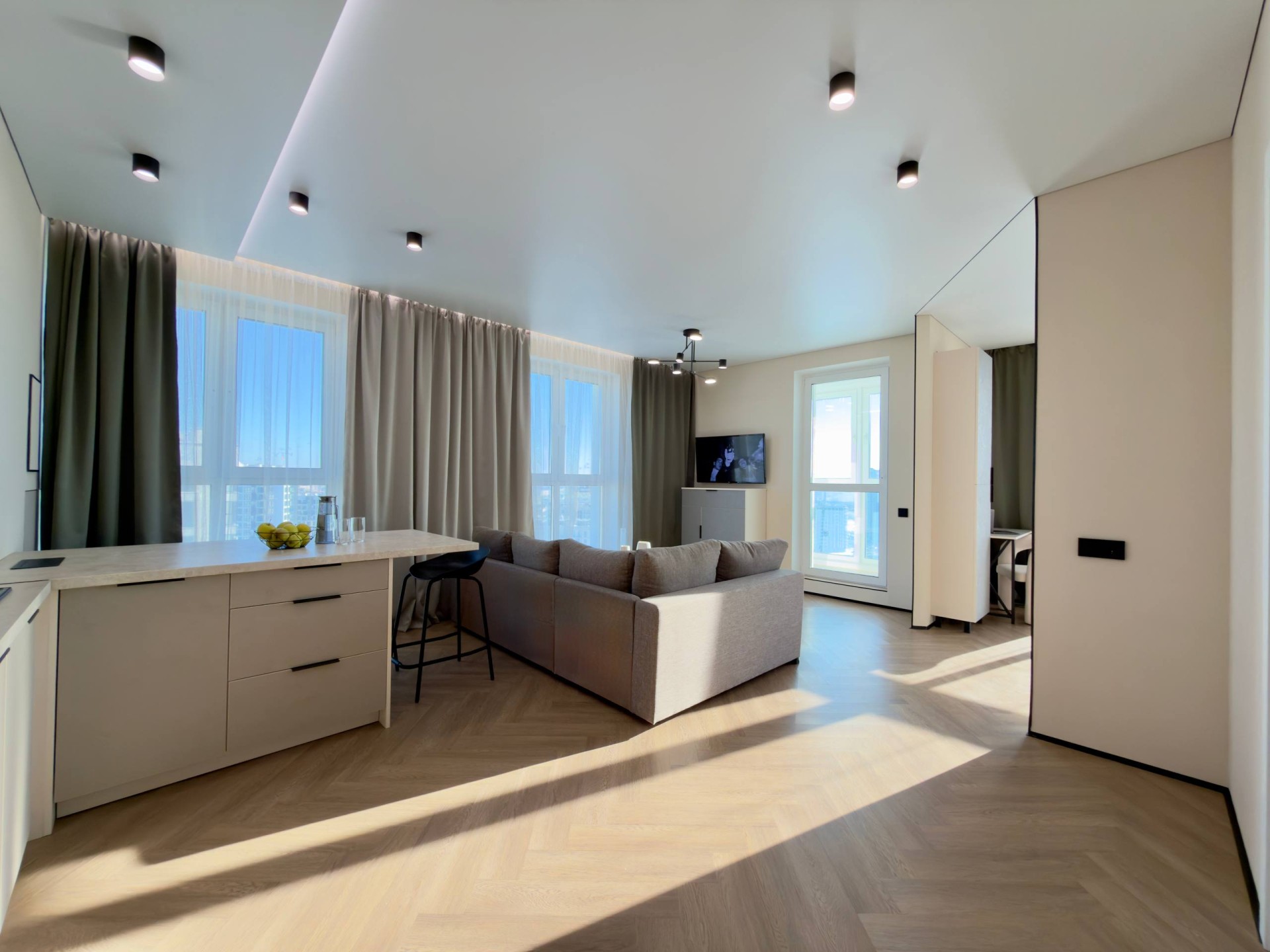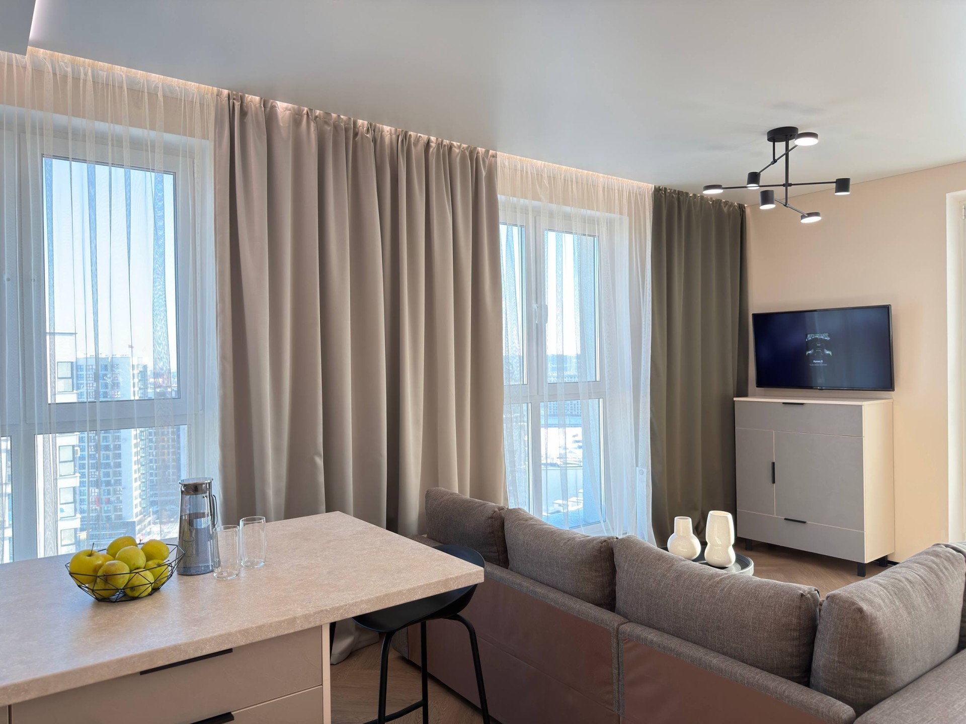 Апартаменты, квартира (комфорт+) под названием «саквояж», ждут своих гостей в г. Минске. Квартира расположена в новом доме жилого комплекса ЖК "minsk world" на 21 этаже с панорамным видом на город.