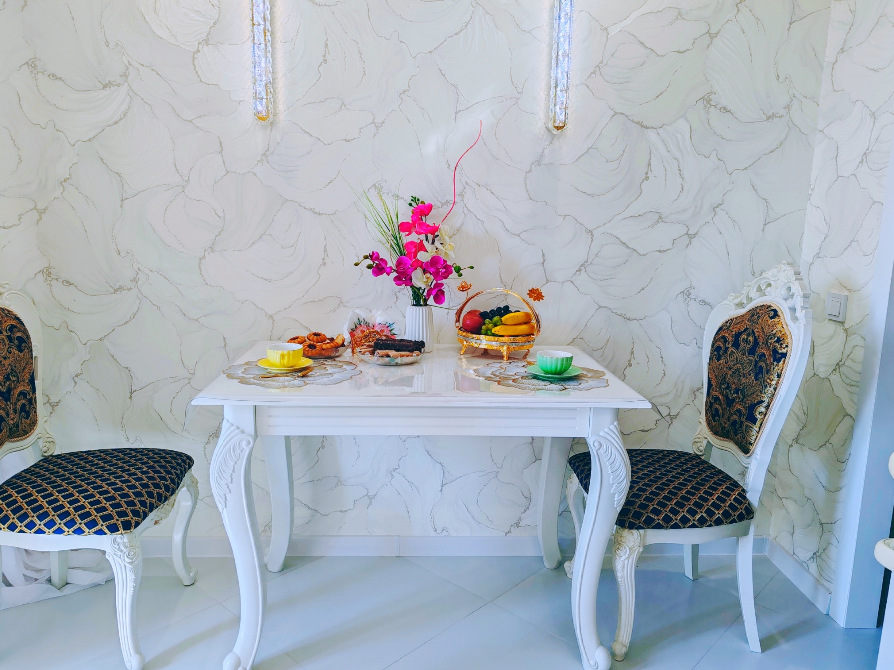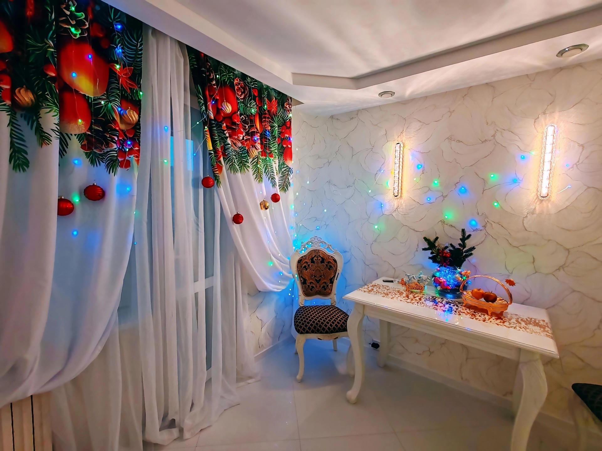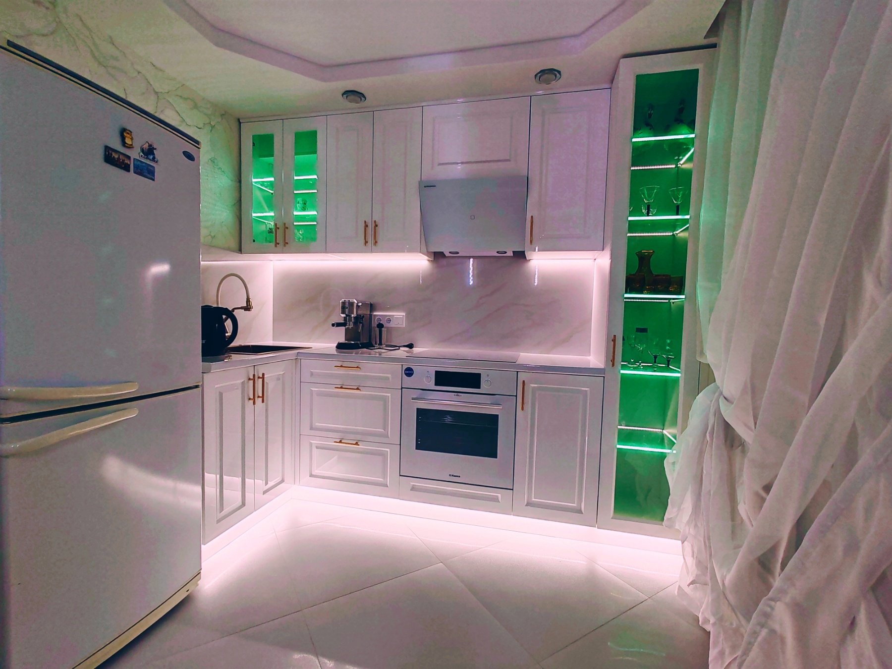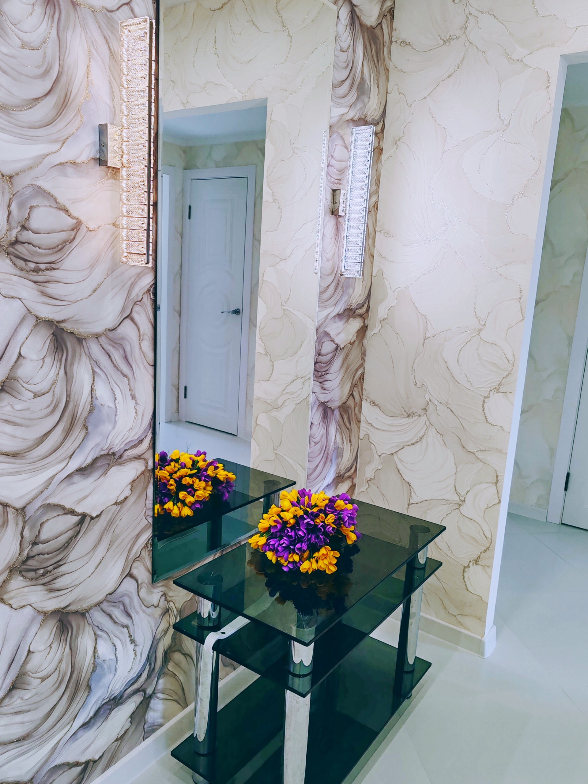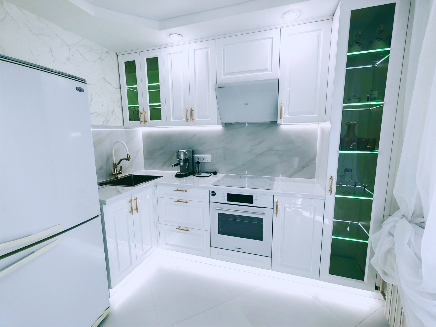 Белоснежные полы, искрящиеся как снег под лучами солнца, в коридоре и на кухне.