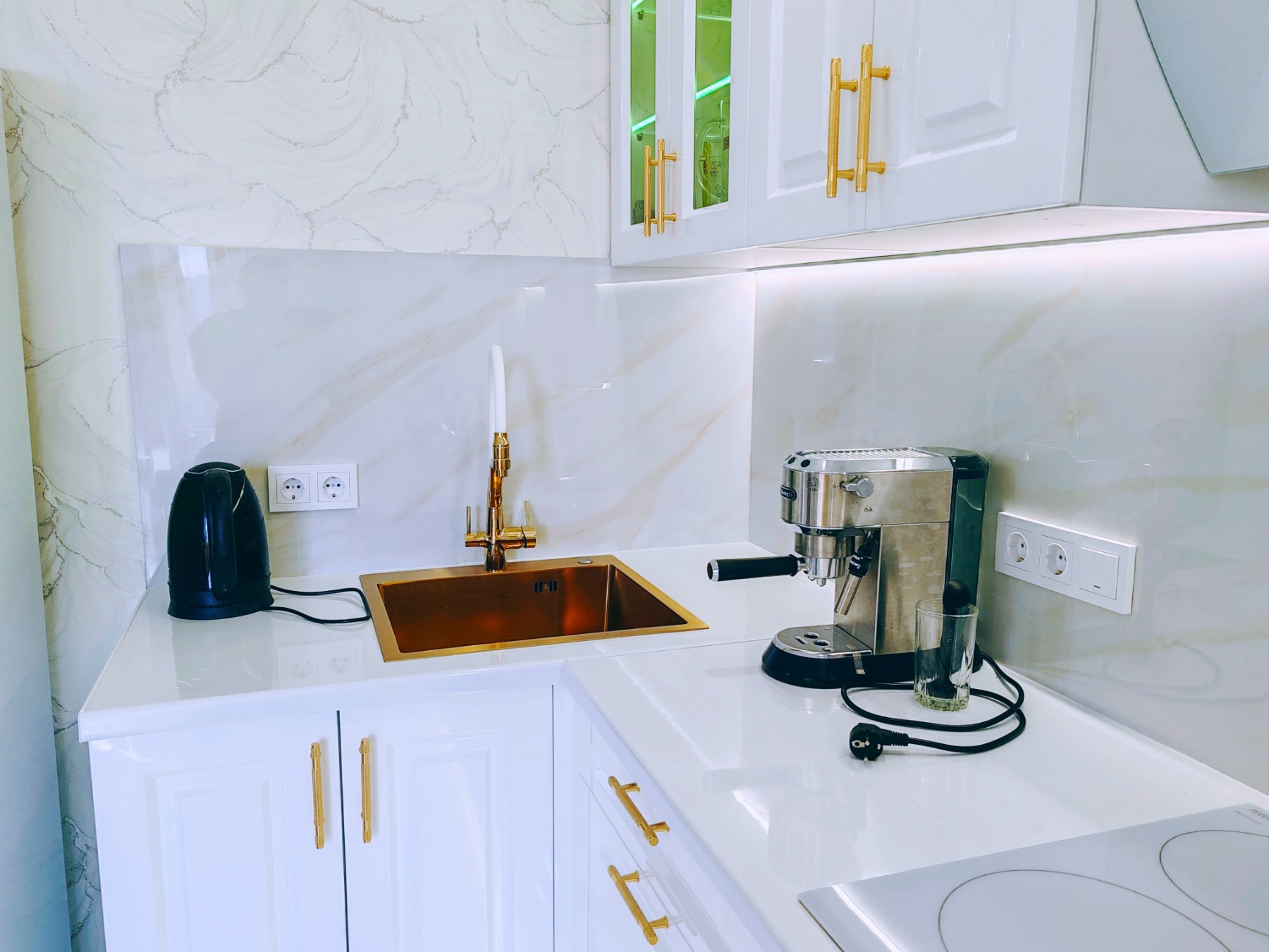 Современная белоснежная кухня с кофеваркой DeLonghi (несколько видов кофе и чая, сахар), тарелки и чашки из фарфора! Индукционная варочная панель с 4 конфорками и все необходимое, в том числе для длительного проживания.