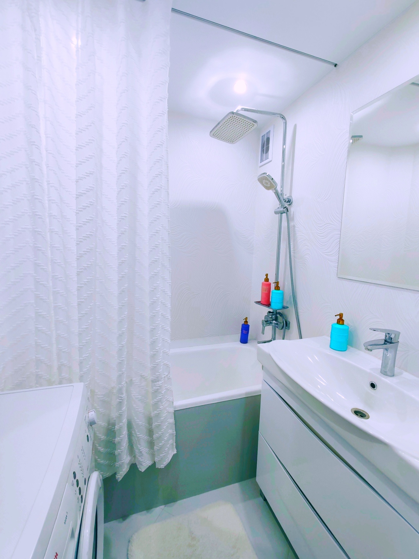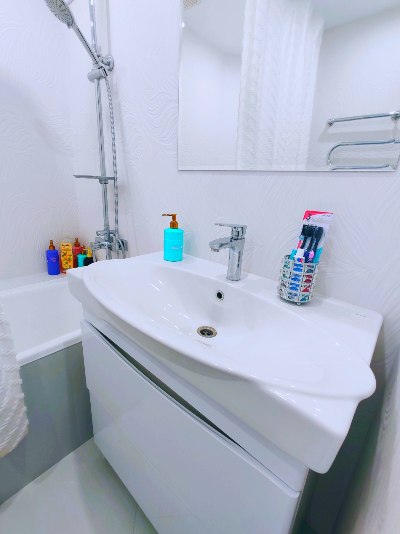 Ванная комната с тропическим душем и сверкающей белой рельефной плиткой, укомплектованная необходимыми принадлежностями (полотенца Bolangde)